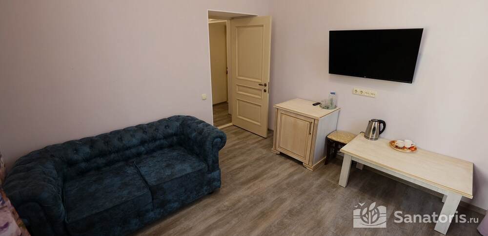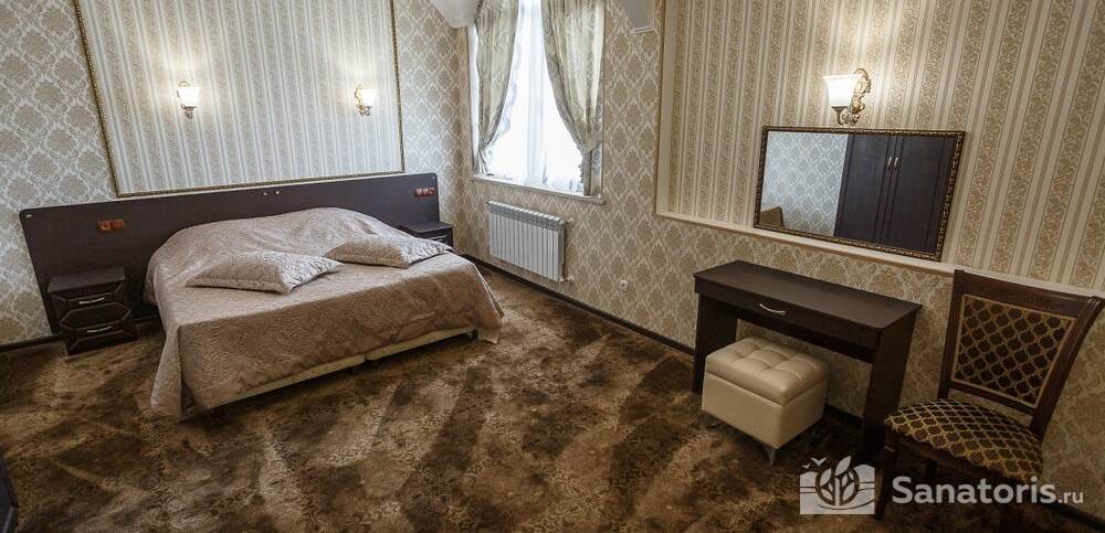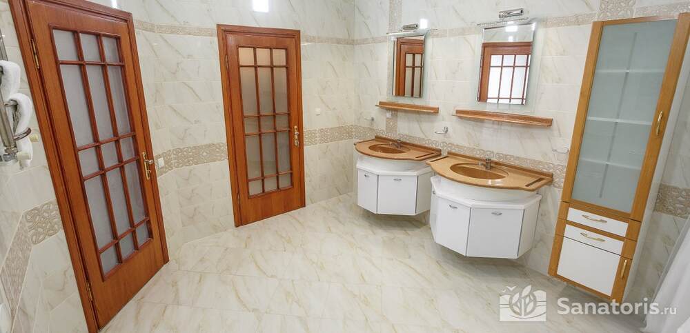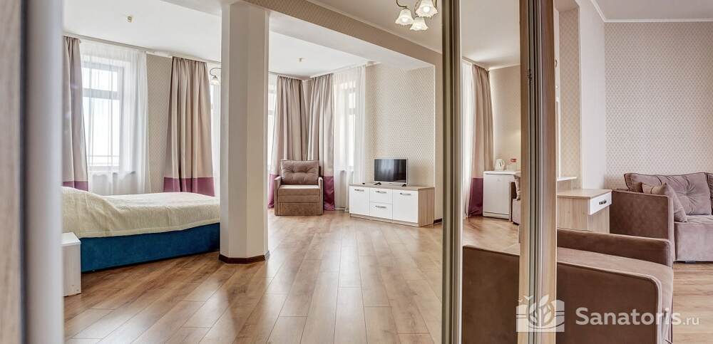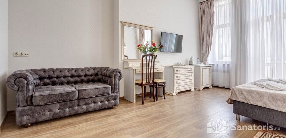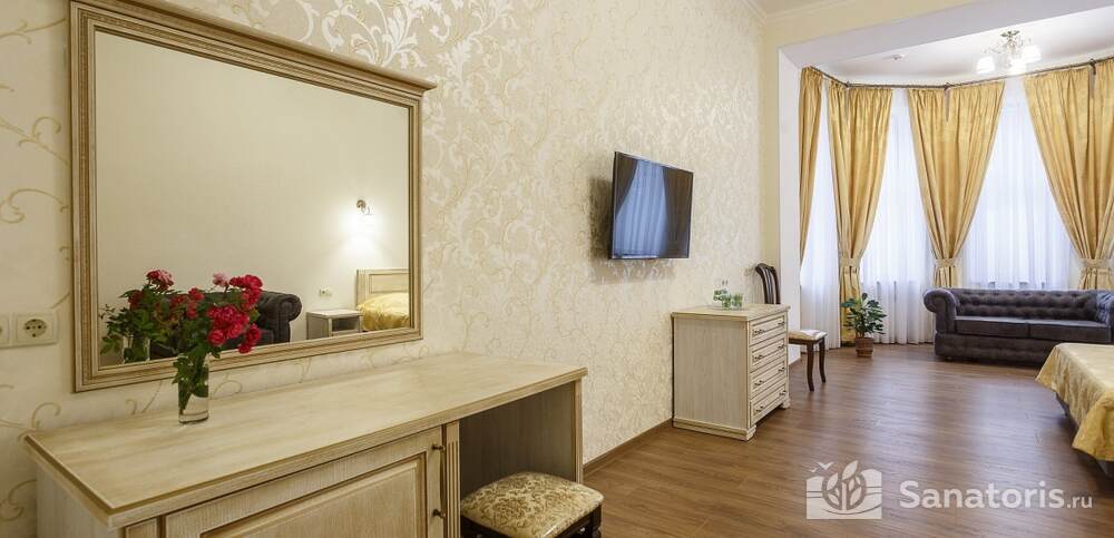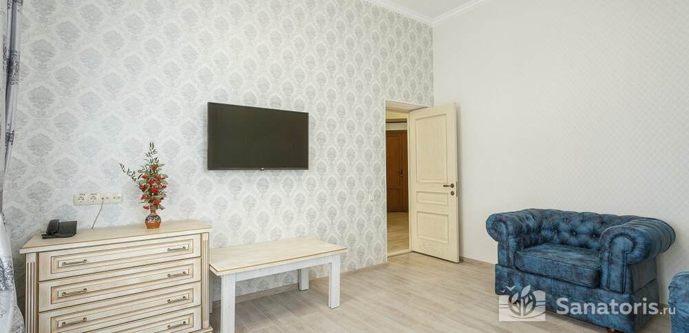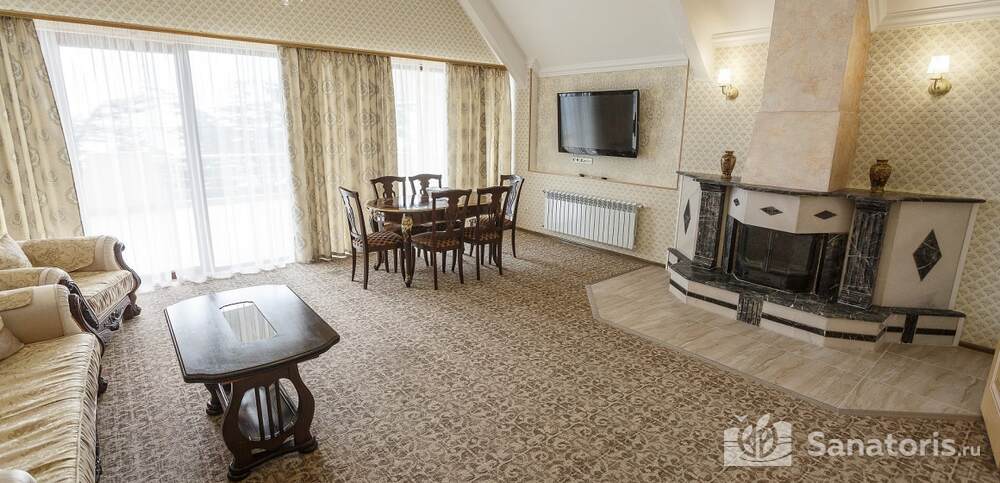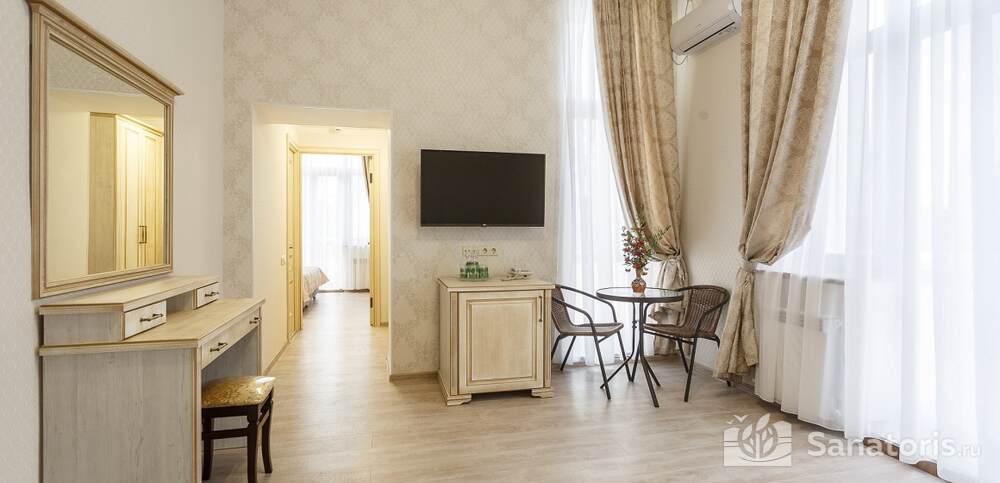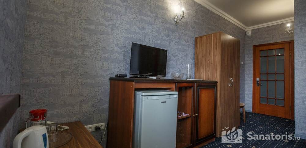 Номера комфортные и оснащены всем необходимым. В них имеется холодильник, кондиционер и телевизор, отдельные ванные комнаты. Недалеко от него раскинулось море и песчаный пляж. Вблизи санатория бьют минеральные источники. Ежедневное употребление такой воды укрепляет иммунную систему, избавляет от воспалительных процессов и простуд, положительно влияет на организм человека в целом.