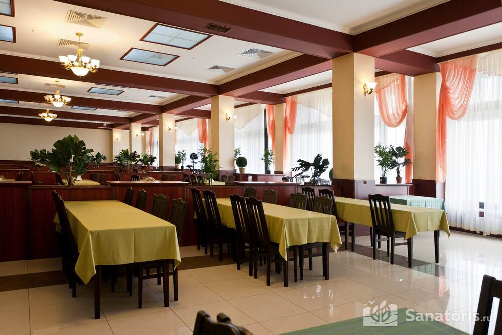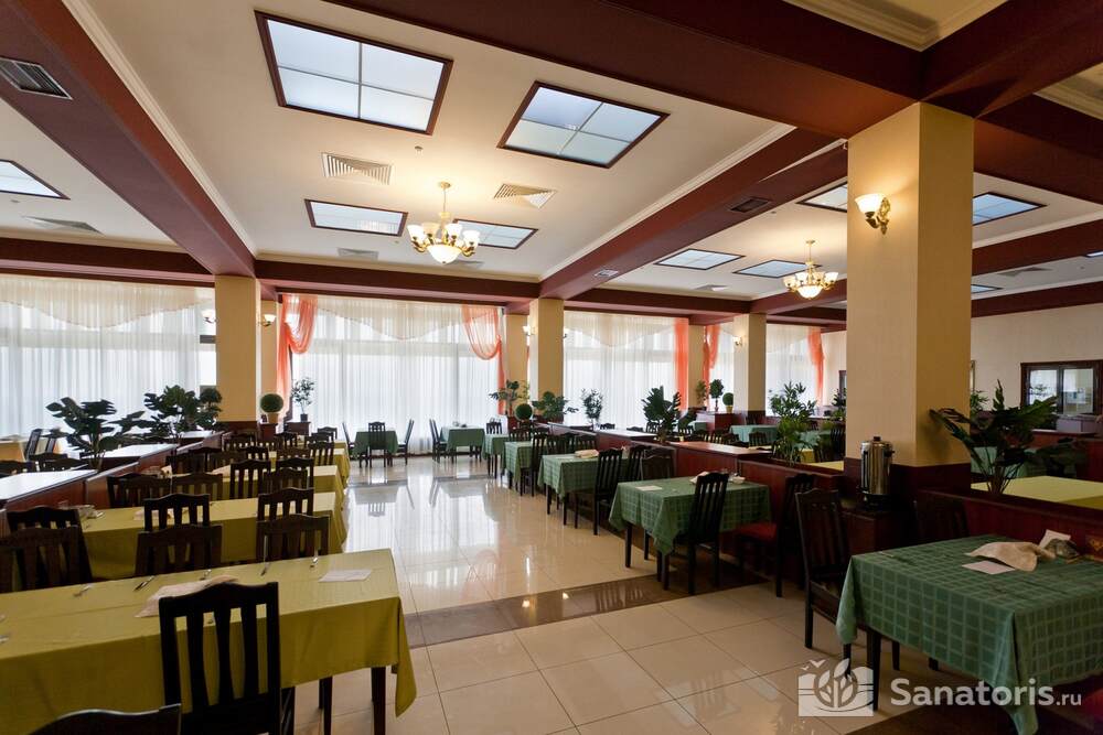 Питание может быть диетическим с предварительным заказом блюд, а может быть по системе шведского стола. Для этого санаторий предлагает посещение сразу двух столовых, рассчитанных на достаточное число отдыхающих. Это позволяет удовлетворить вкусы всех приезжих, независимо от их личных предпочтений.