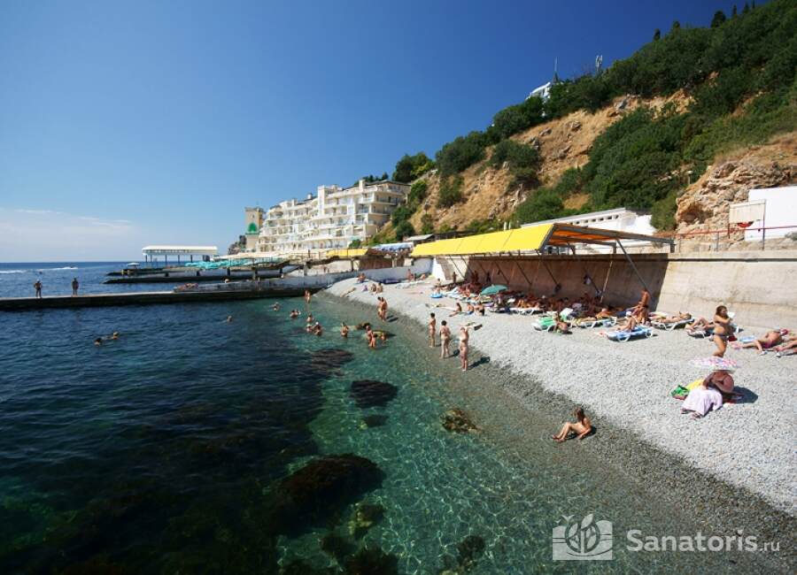 На собственный галечный пляж санатория отдыхающие могут спуститься на фуникулере, на пляжной зоне есть шезлонги и зонтики от солнца, а также солярий, лодочная станция и бар.