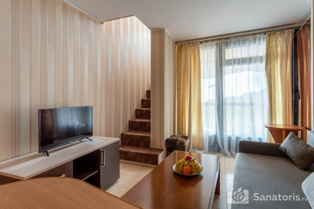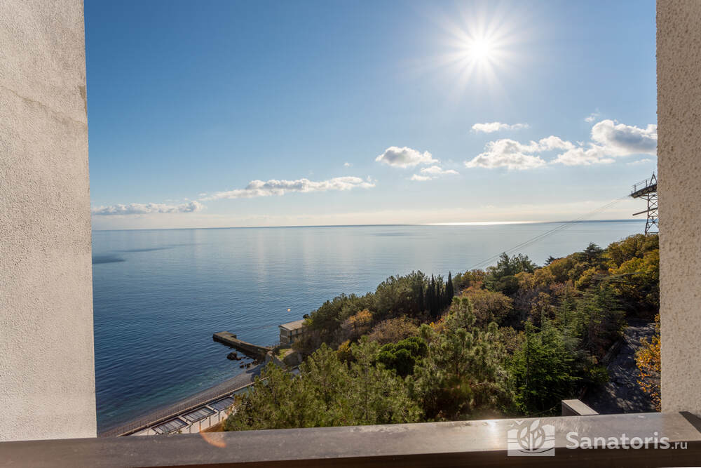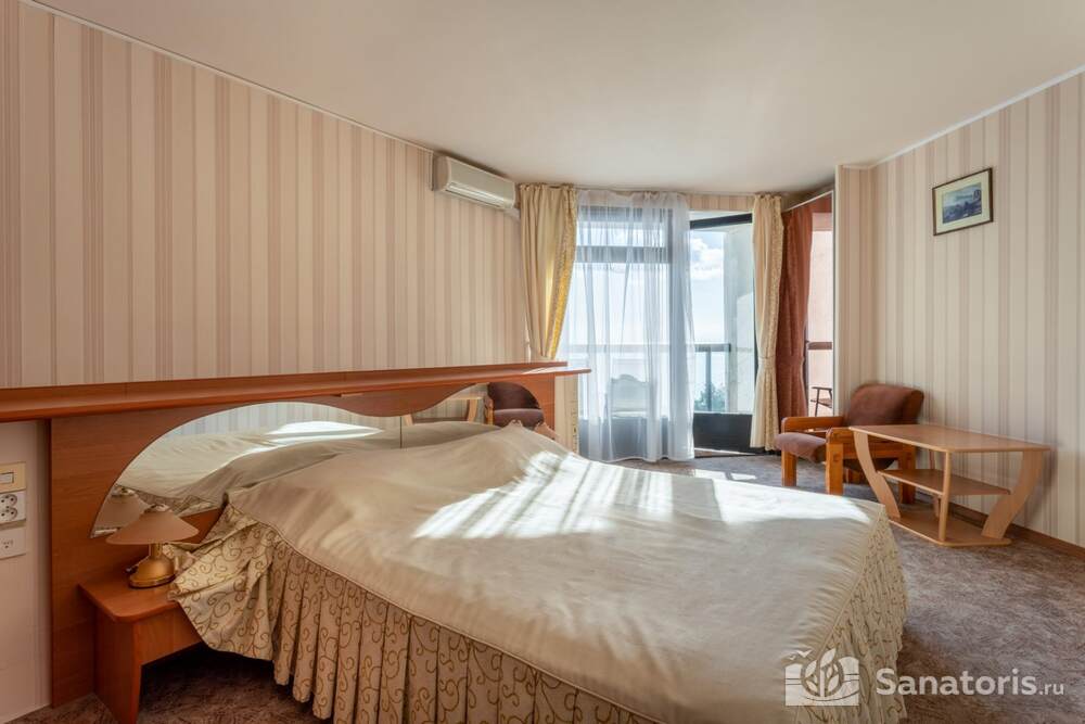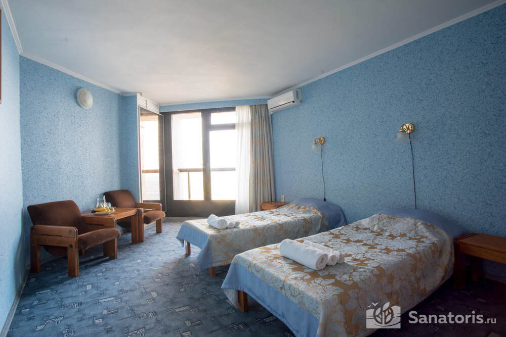 Все номера имеют необходимый набор техники и удобств для комфортного проживания. Это телевизор, кондиционер, холодильник, совмещенный санузел. Расслабляясь на балконе, можно любоваться красивыми пейзажами. Вид из номеров, распложенных на южной стороне, открывается на море. Северная сторона дарит вид на парк и склон холма. Одновременно в санатории могут размещаться 500 человек.