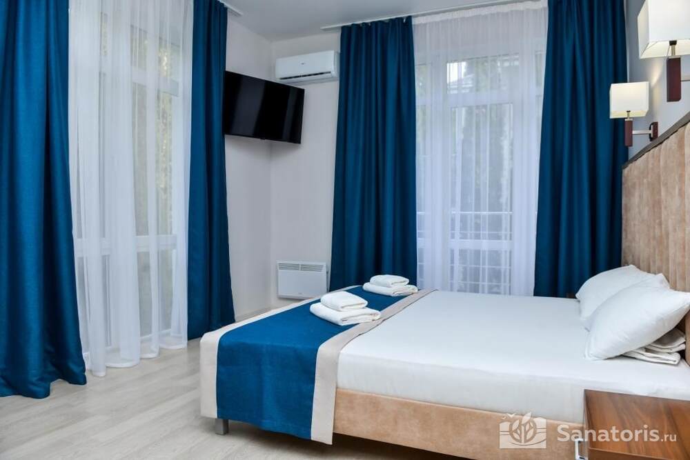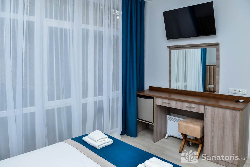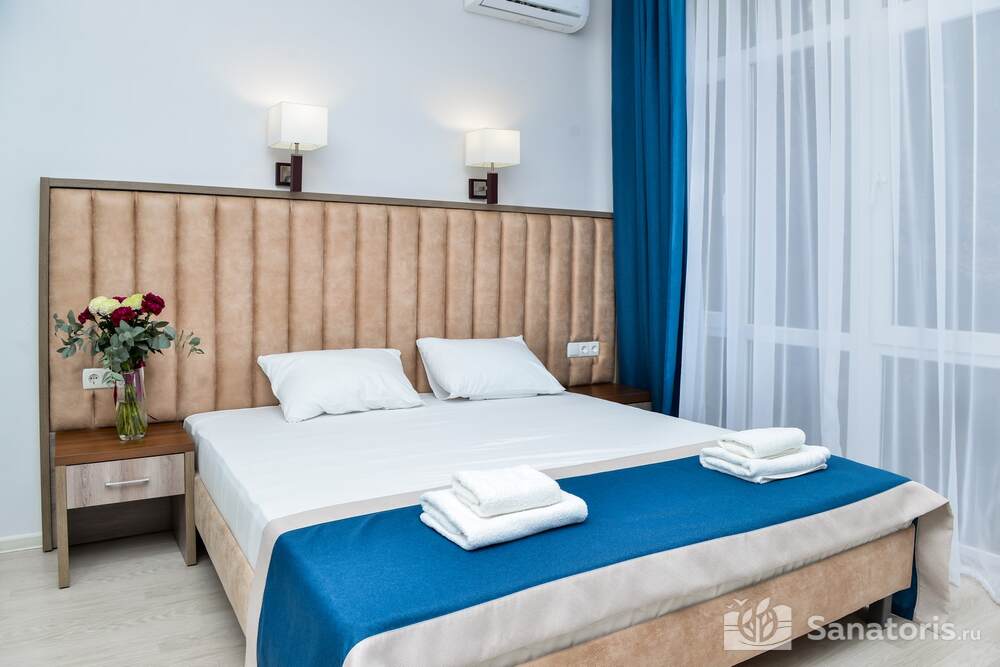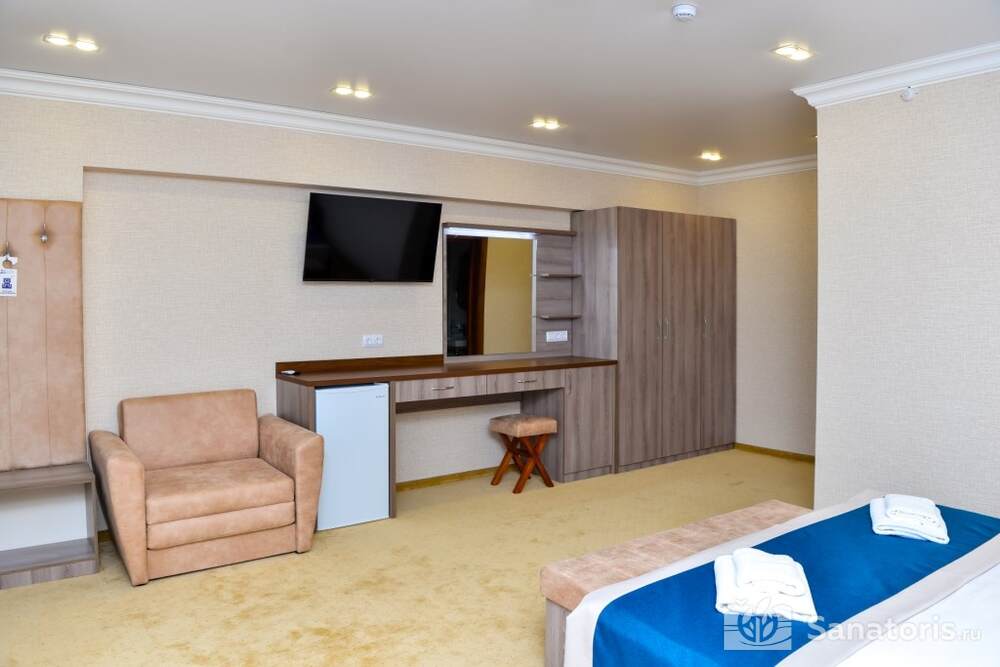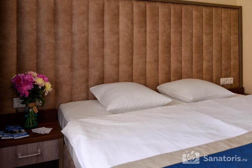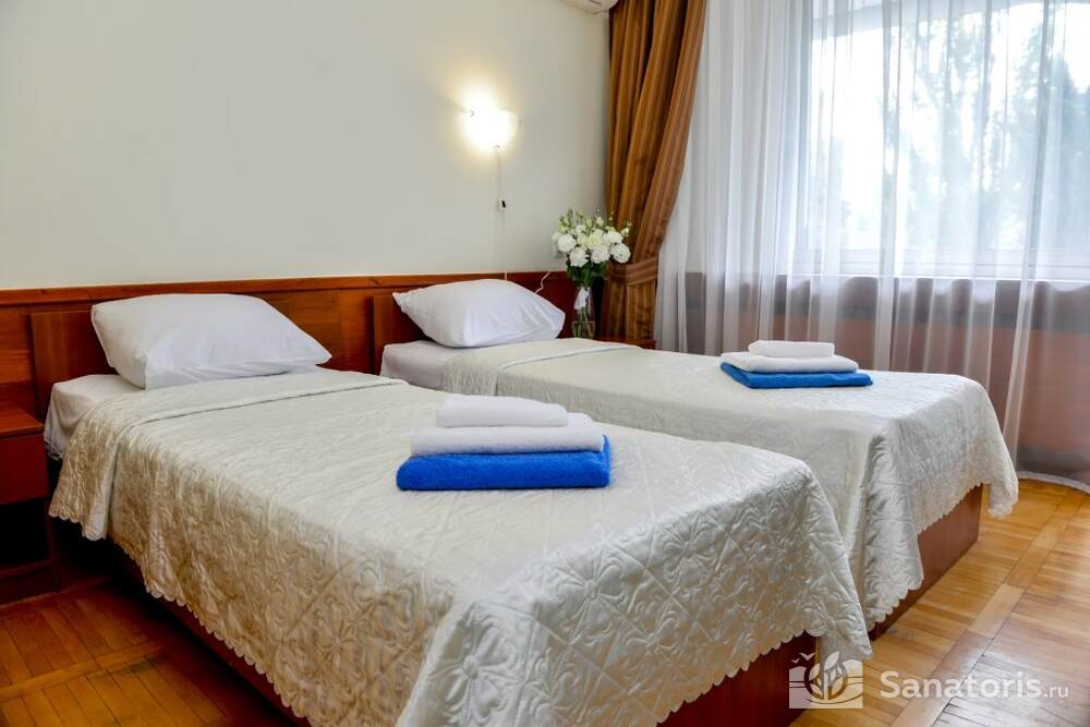 Пансионат, построенный в 1990 году, состоит из 5 корпусов и вмещает 400 гостей. Жилой фонд представлен комфортабельными номерами, которые оборудованы санузлами, всей необходимой мебелью и техникой, включая ТВ, холодильник и сплит-систему.
