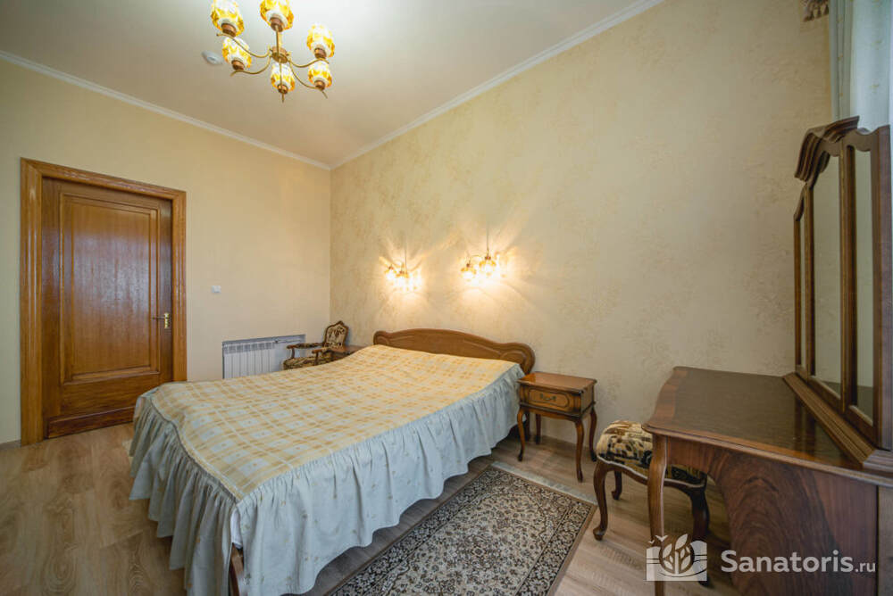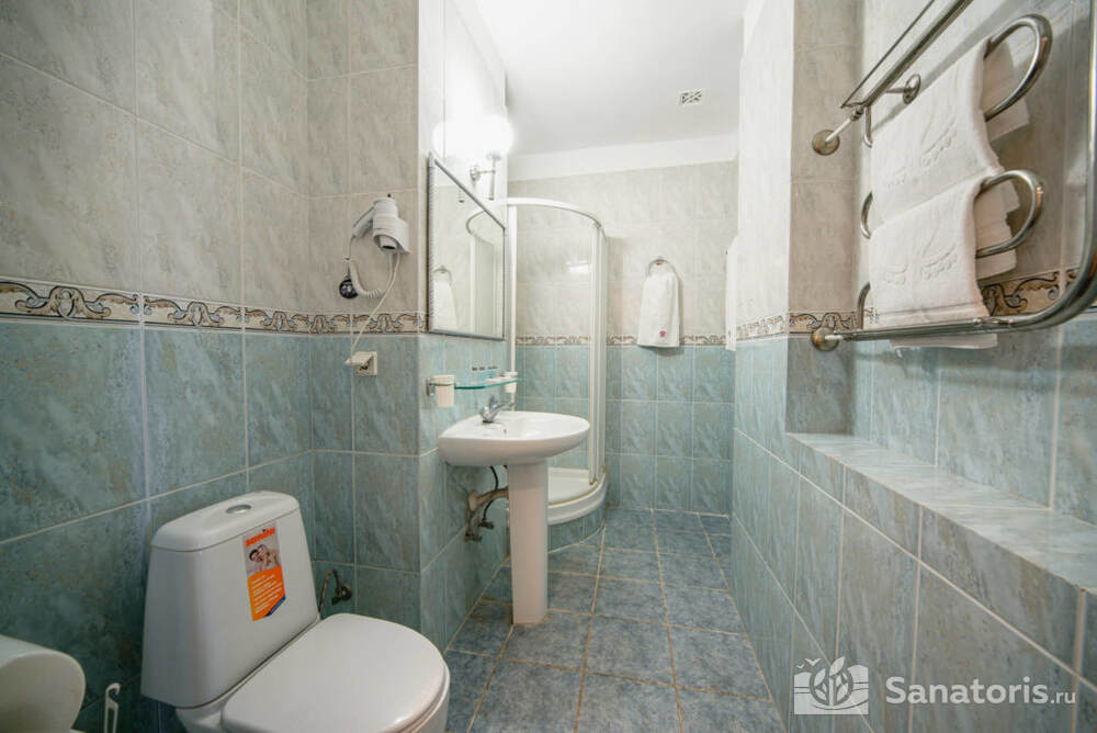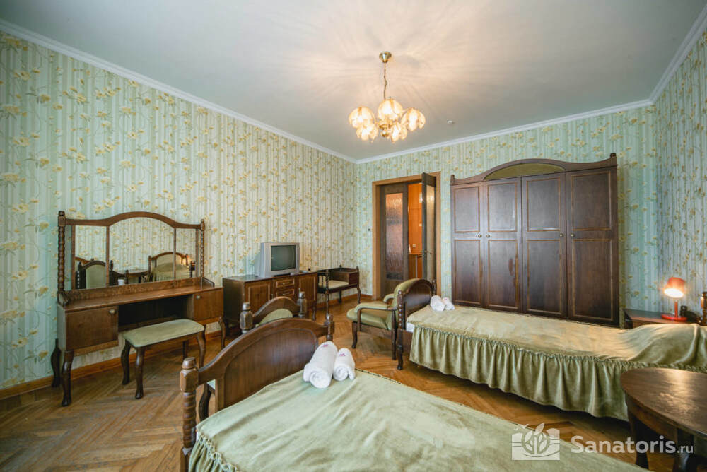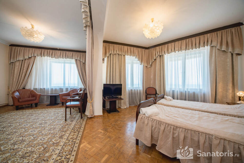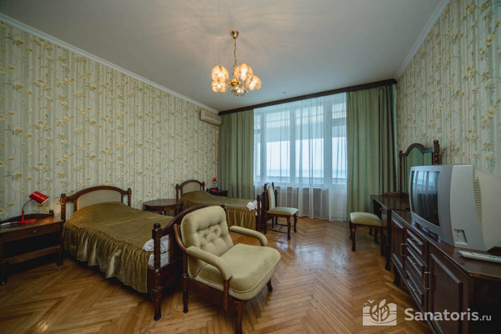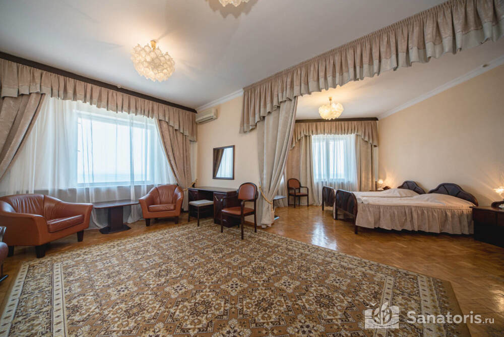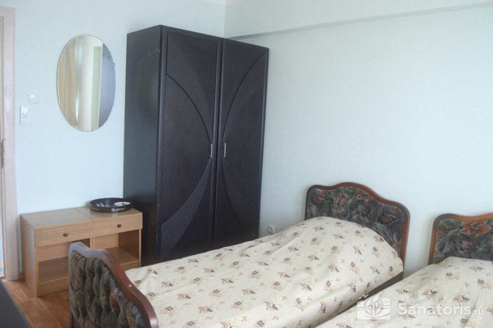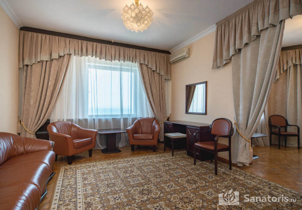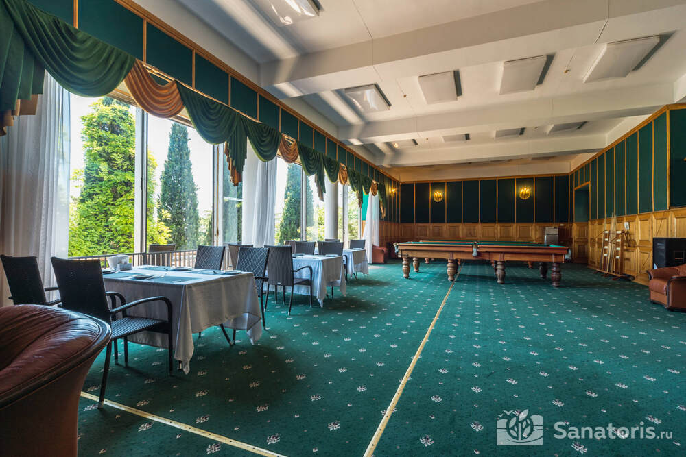 Номера комфортные и эконом-класса. В качестве досуга предлагается плавание в бассейне. На территории санатория их два, с морской и пресноводной водой. Имеется ванна с гидромассажем, а также подводными гейзерами. Можно посетить баню, поиграть в теннис или бильярд, посетить спортивную площадку. На территории здравницы работает библиотека и кинозал. Регулярно для гостей санатория организуются увлекательные экскурсии.