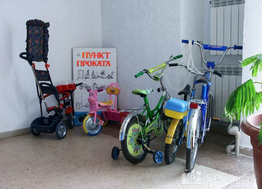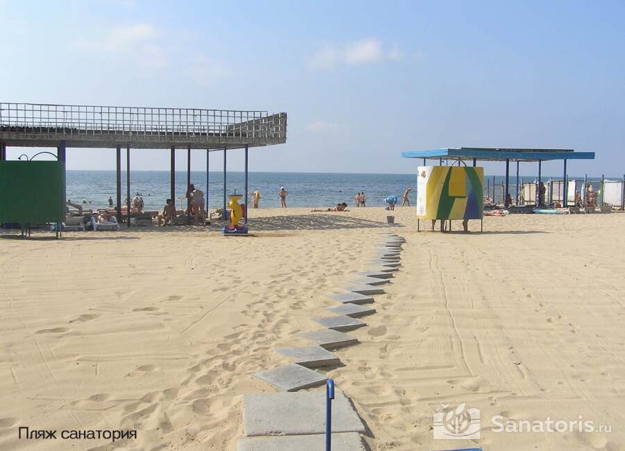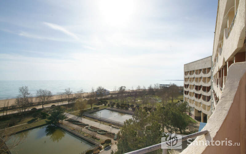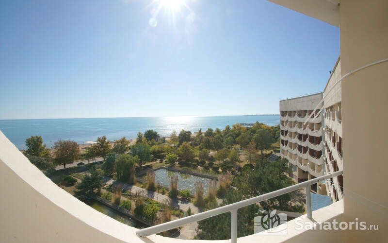 Корпус санатория состоит из шести этажей и располагается не далее ста метров от частного пляжа, оснащенного топчанами и навесами от солнца. Другой необходимый инвентарь можно взять в аренду в пункте проката здравницы.