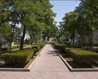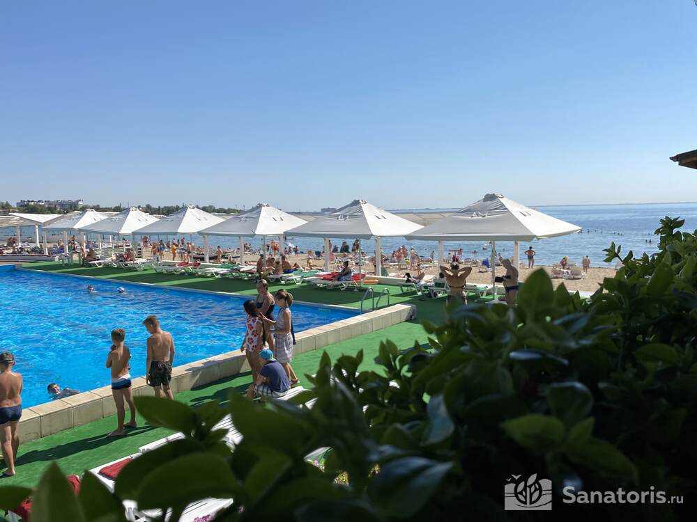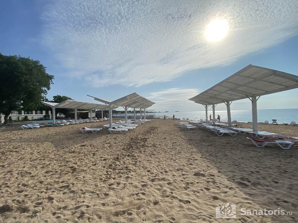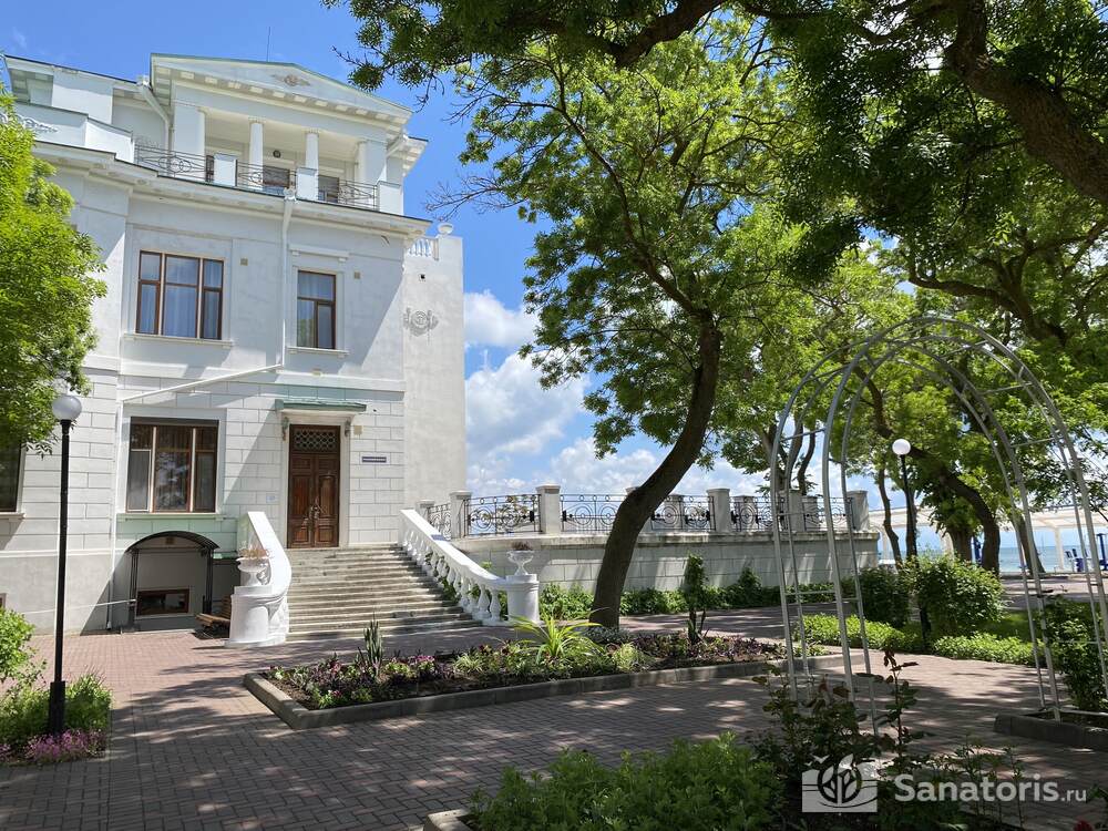 Санаторий Золотой берег находится в центре потрясающей Евпатории. Он расположился на берегу моря в парке Фрунзе. Много лет назад на его месте была построена усадьба Терентьева. С тех пор здесь остались гигантские сосны и кипарисы, можжевельник и кедры, гранаты и хурма, благодаря чему создается потрясающая атмосфера.