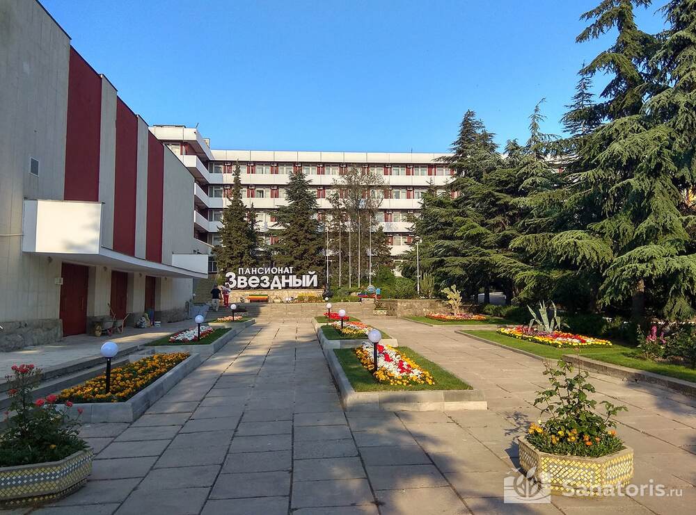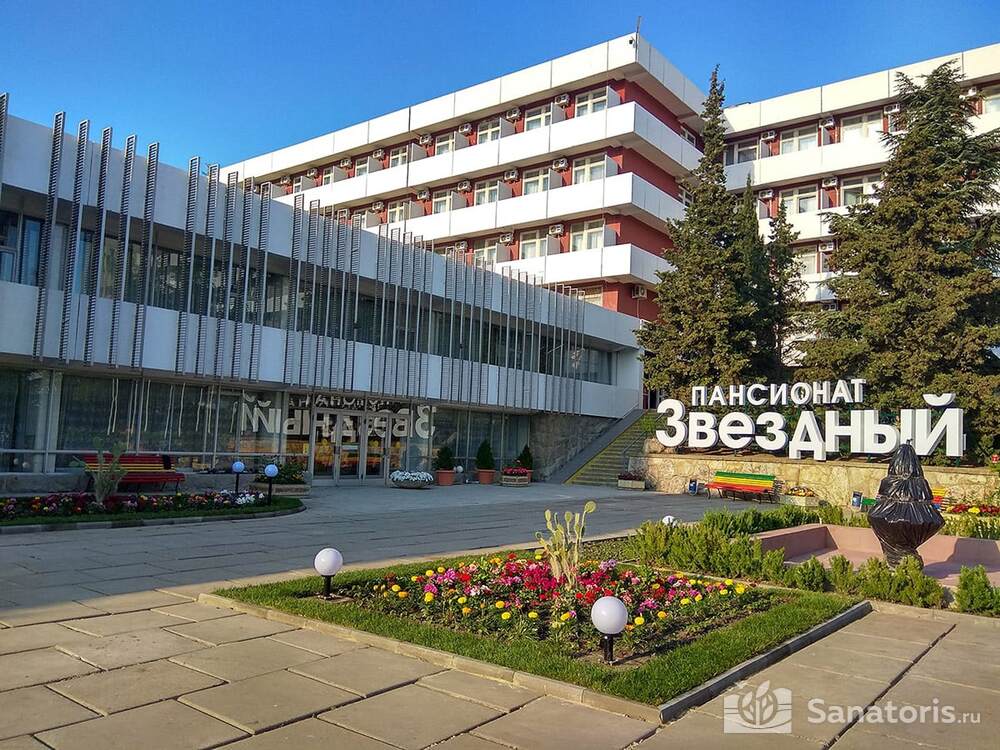 Санаторный пансионат Звездный находится в городе Судак в окружении живописного парка. Здание его насчитывает пять этажей, передвигаться по которым можно и с помощью лифта. Вместить здравница готова более пятисот человек. Номера трехместные и двухместные. В них имеется все необходимое, в том числе и кондиционеры.