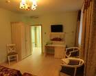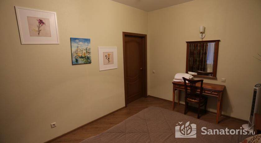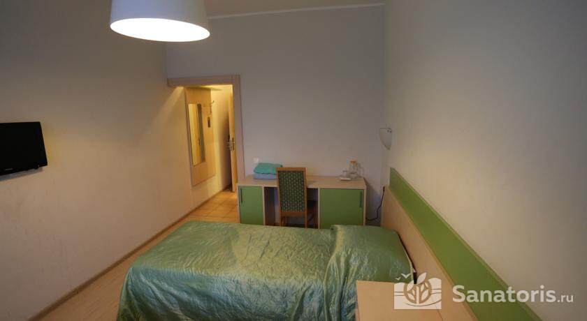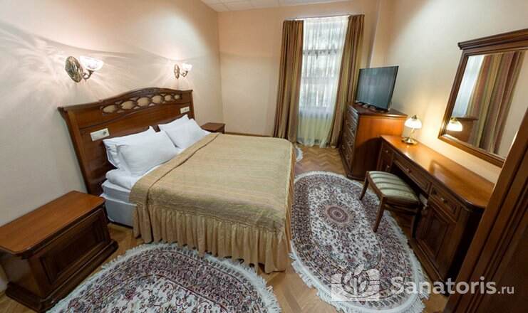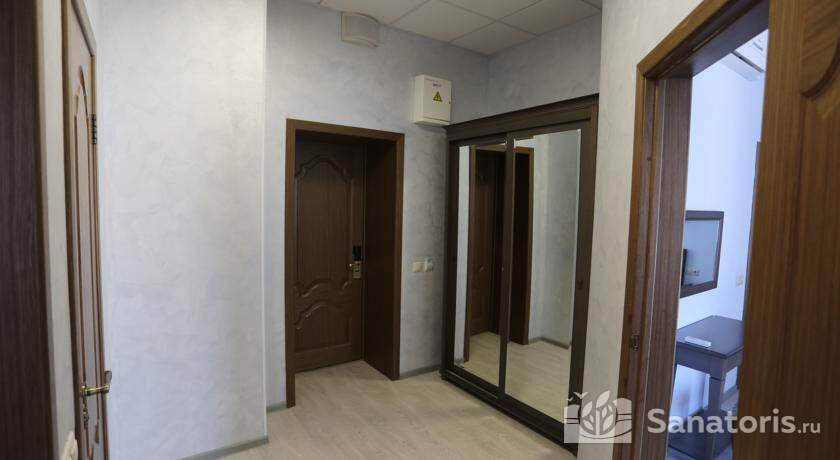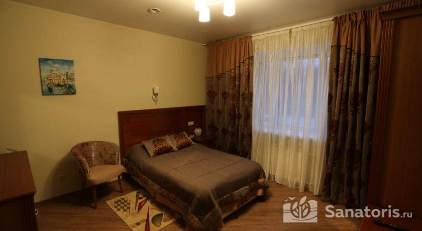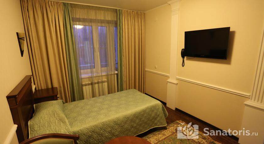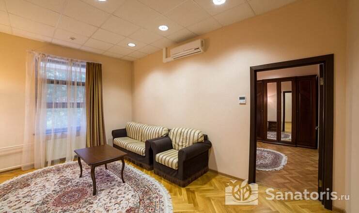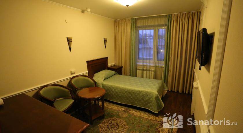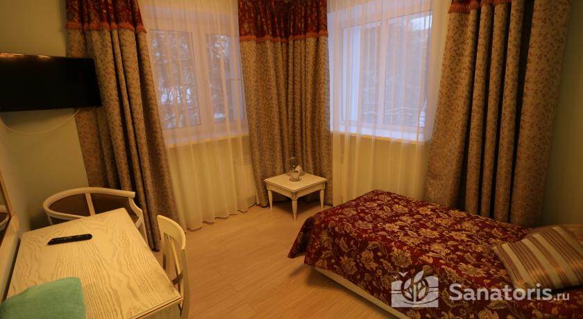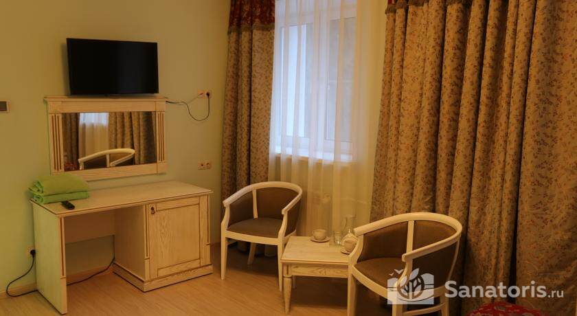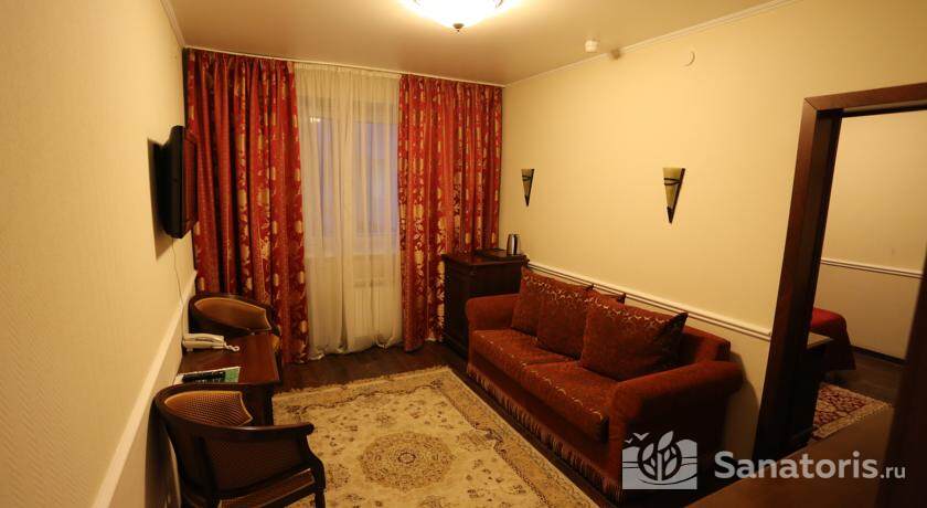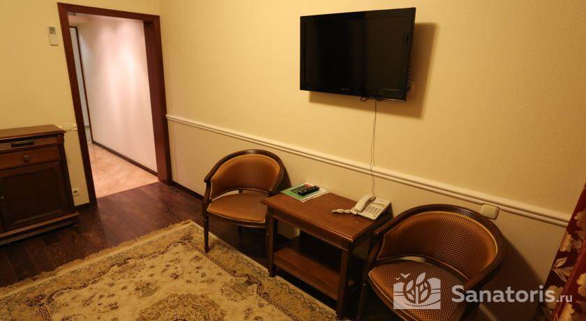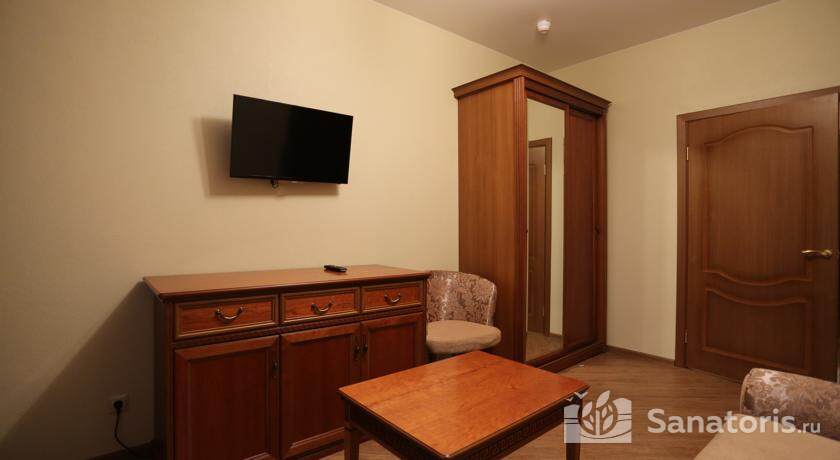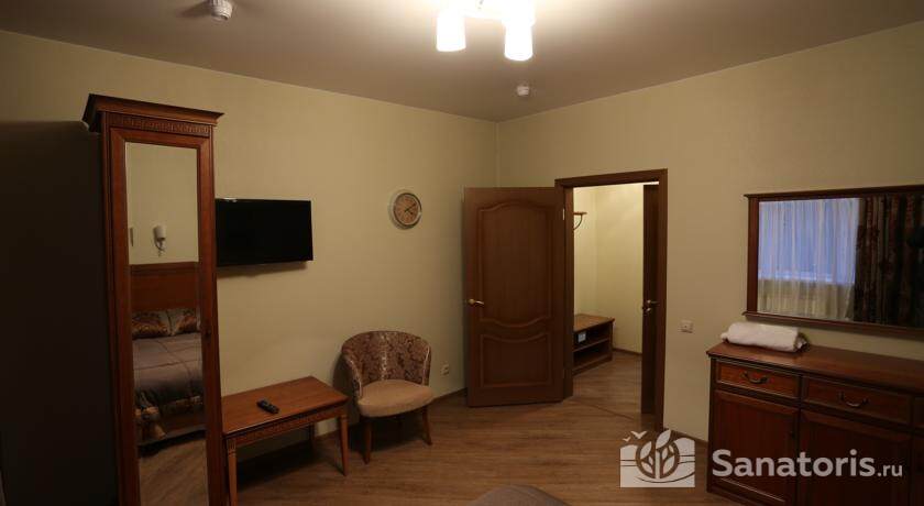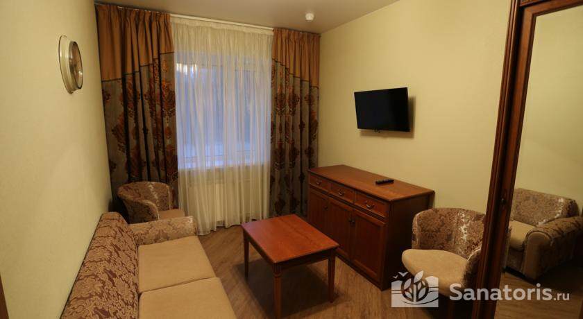 Гости санатория проживают в комфортных апартаментах. В каждом номере есть плазменный телевизор, современная мебель, санузел, ванная комната. Постояльцам предоставляют косметические принадлежности, фен, спальный комплект и полотенца.
