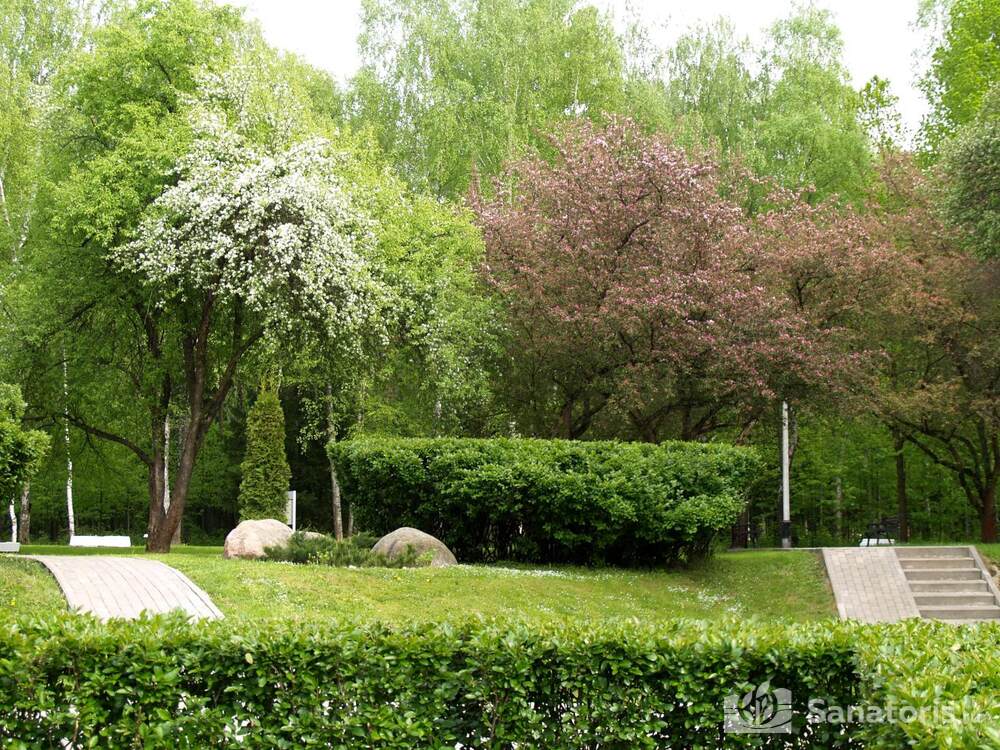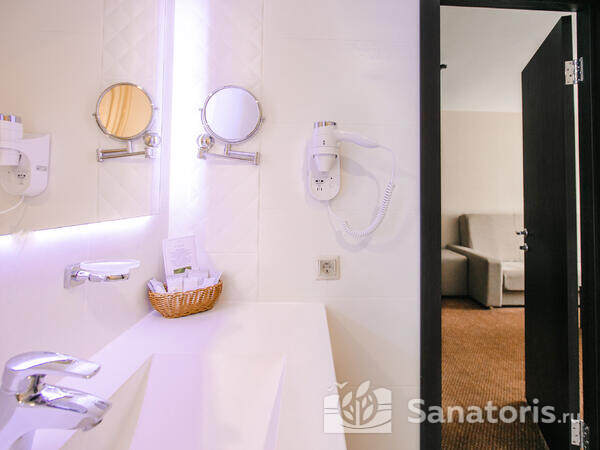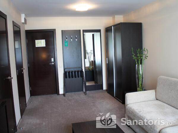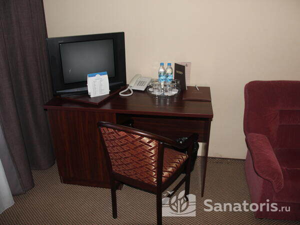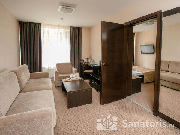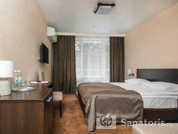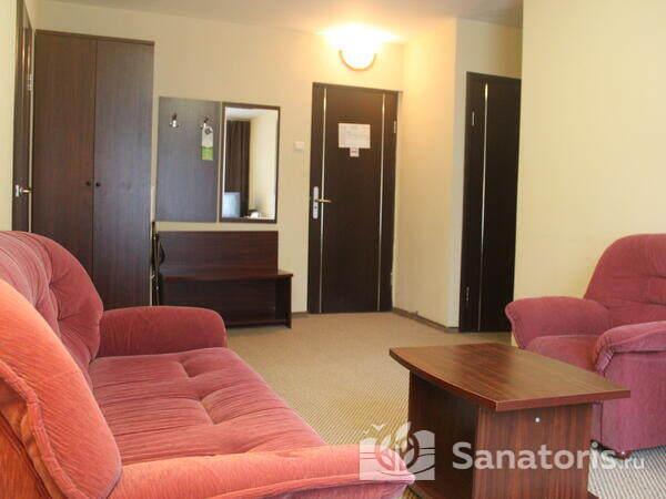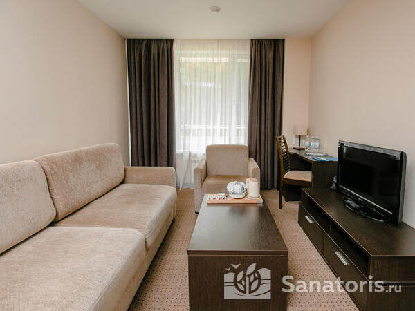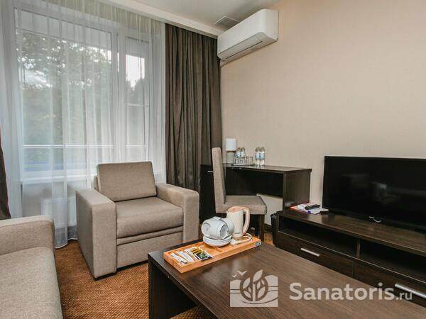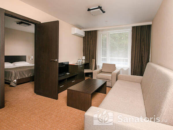 Находится здание санатория в самом лесопарке. Что положительно сказывается на самом климате. Здравница представлена двумя корпусами. В жилом здании номера двух видов. Речь идет о люксе и стандарте. При этом все они оснащены балконом, отдельной ванной комнатой, а также мебелью и бытовой техникой. Панорама с каждого номера открывается захватывающая и ей можно любоваться бесконечно.