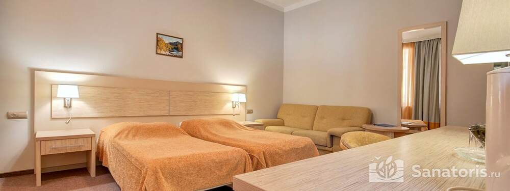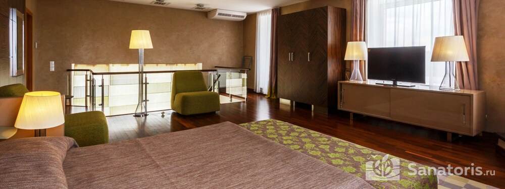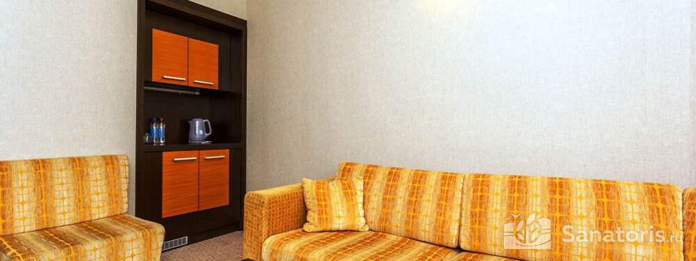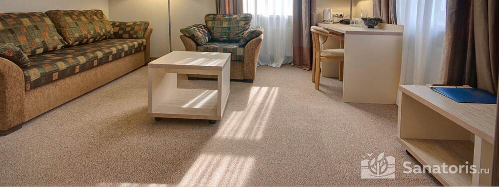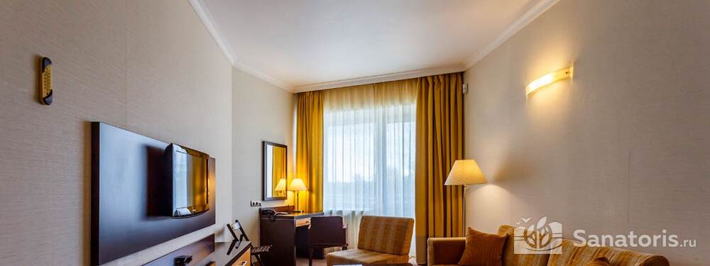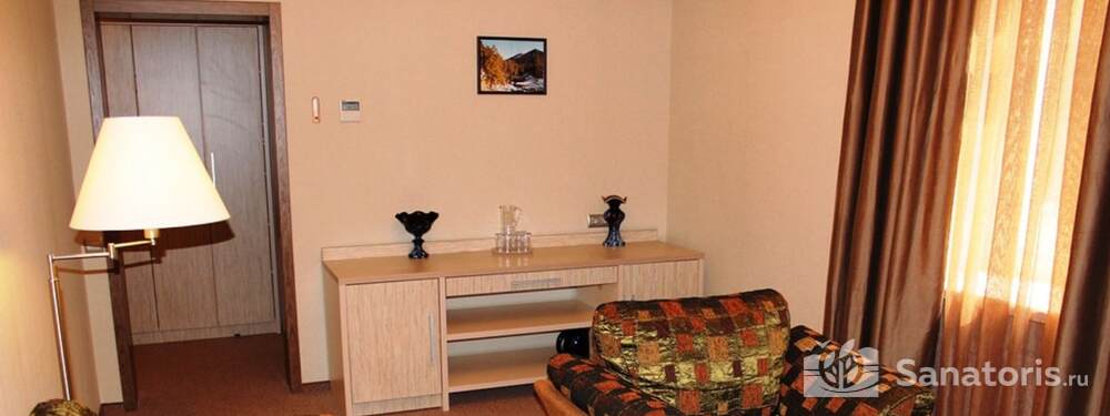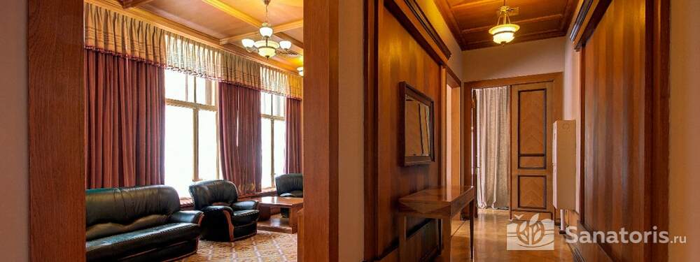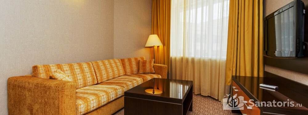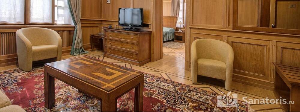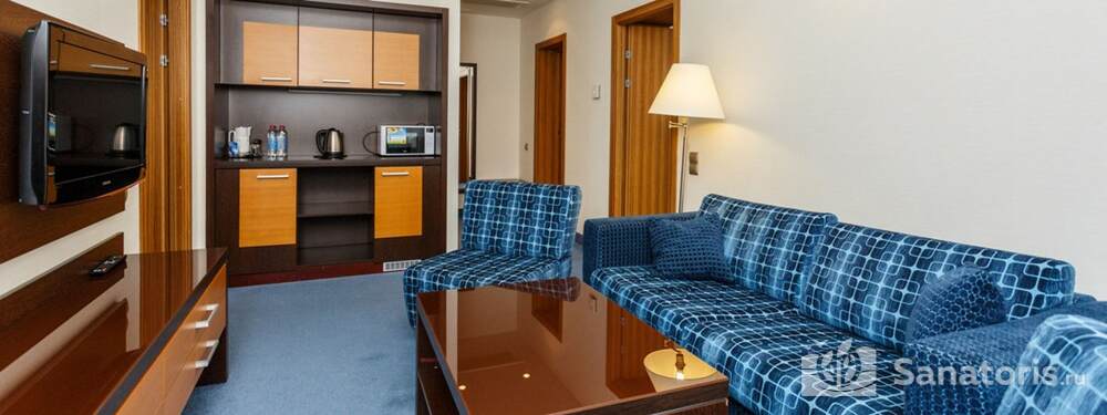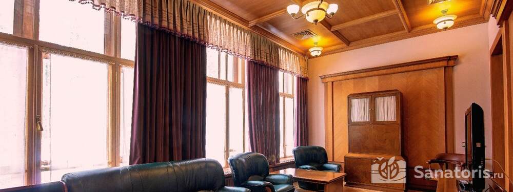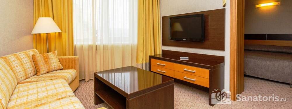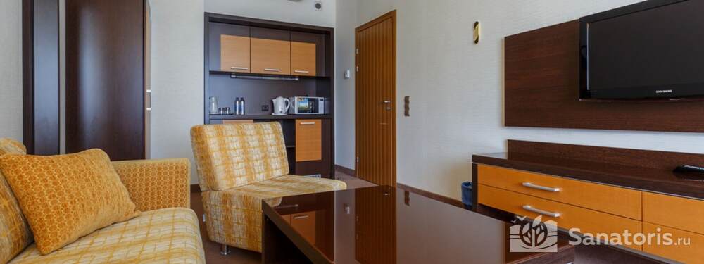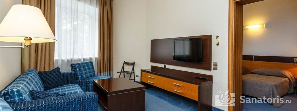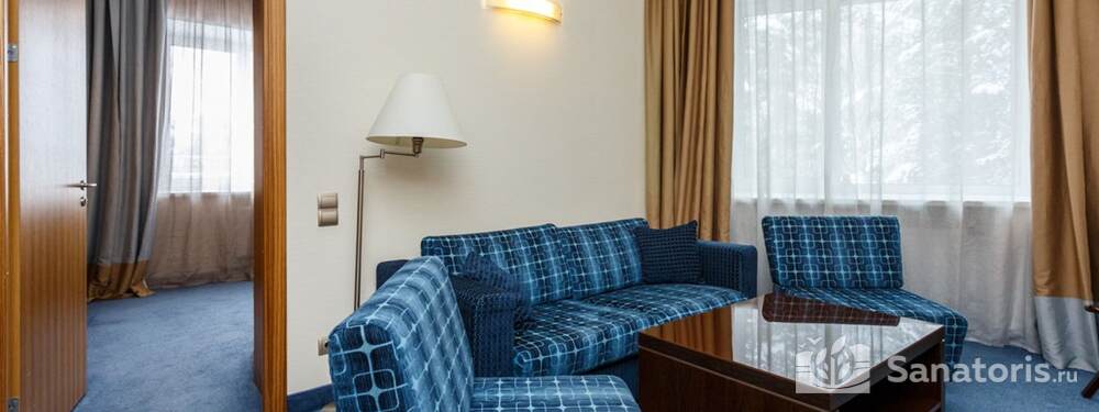 На территории санатория имеются апартаменты, которые могут вместить до трех отдыхающих, что позволяет организовать в нем пребывания всей семьей. Номера обустроены всем необходимым, начиная от журнального столика и заканчивая холодильником. В помещениях класса люкс встречается телевизор, сейф, кондиционер и даже фен. Все это упрощает пребывания в санатории и делает отдых более комфортабельным.