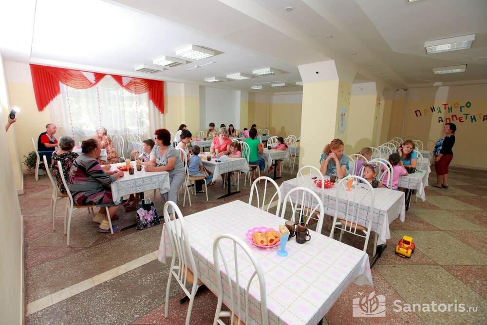 Питание в санатории осуществляется в уютной и вместительной столовой. Отдыхающим предлагается диетический стол, а также классический вариант меню. Питание может быть разработано в индивидуальном порядке с учетом особенностей назначенного лечения. Важно, что все блюда готовятся из натуральных и экологических продуктов местного происхождения. Обеспечивается это тем, что вблизи санатория располагаются животноводческие фермы и сельскохозяйственные угодья. Там выращиваются самые чистые продукты, обогащенные витаминами.