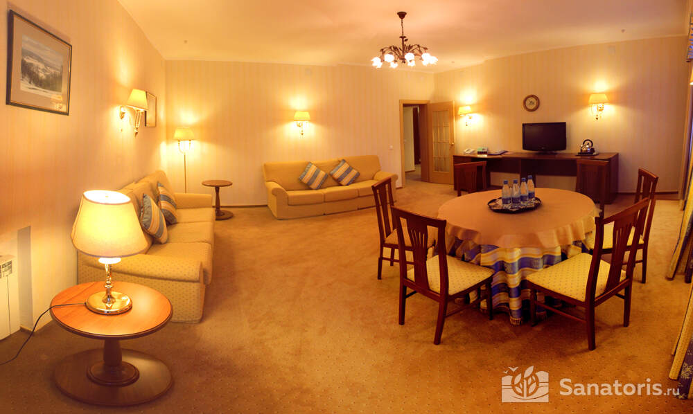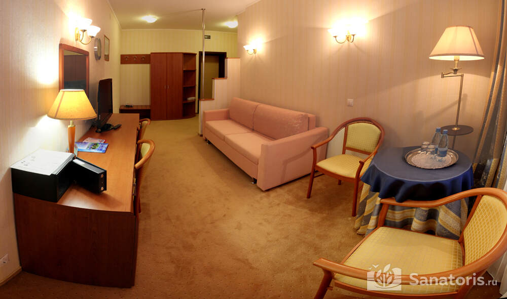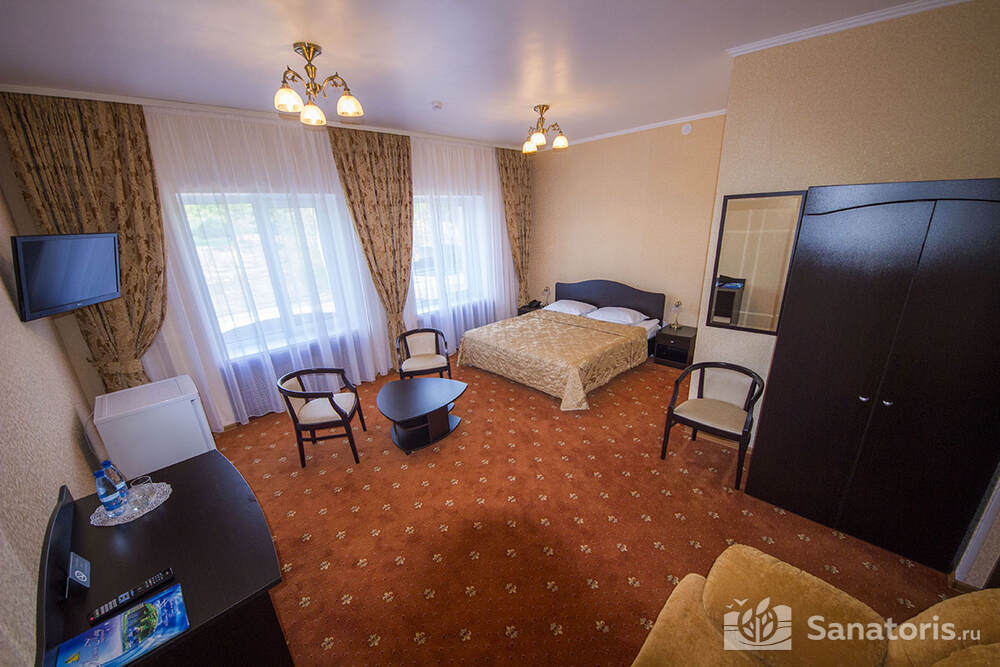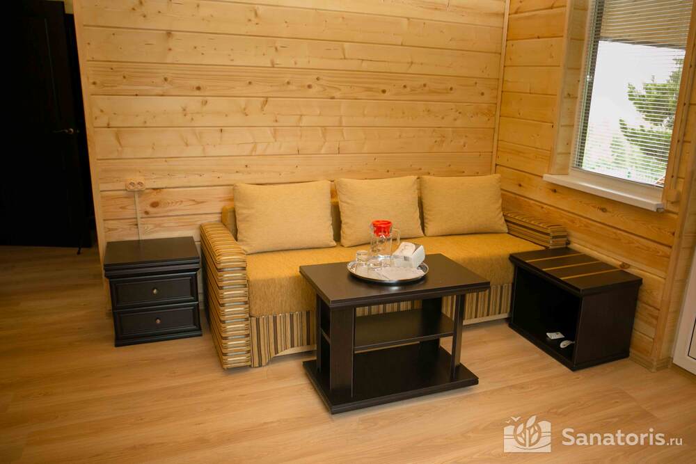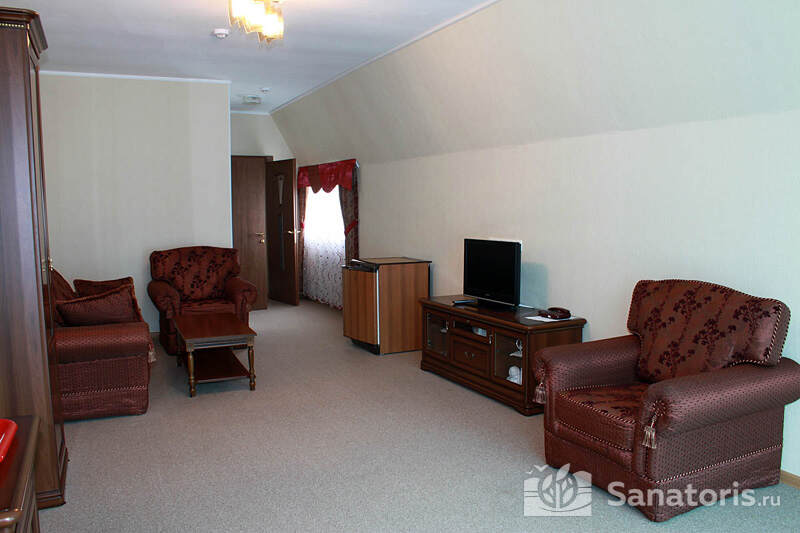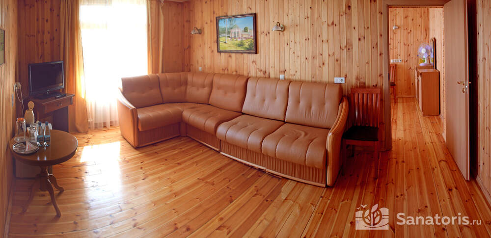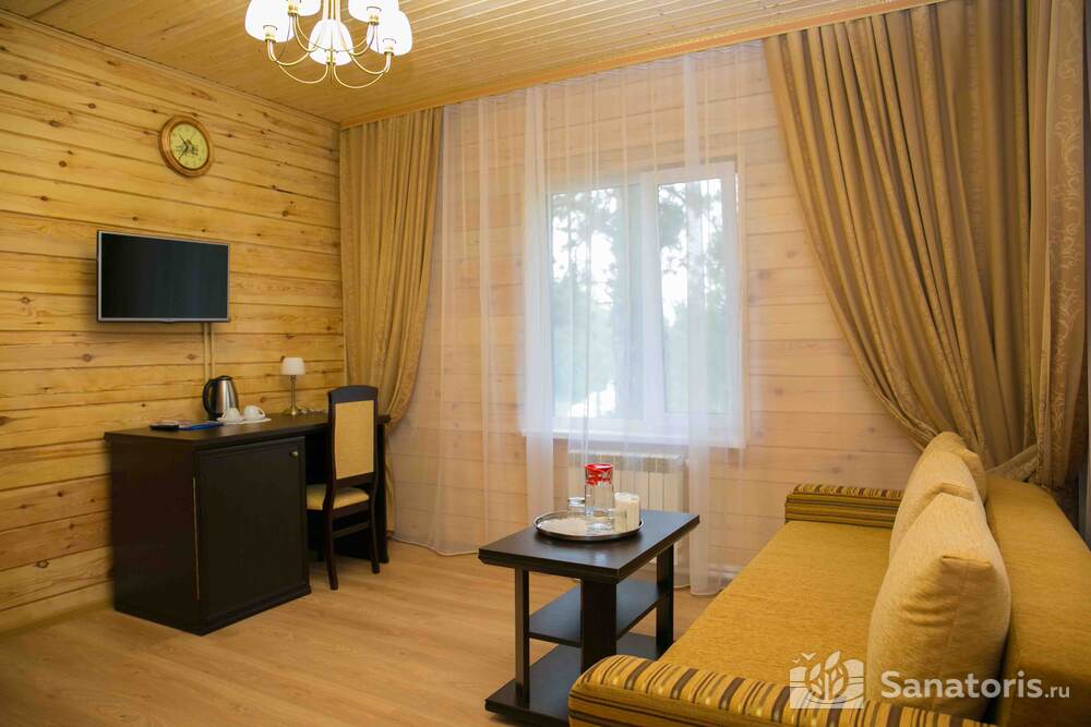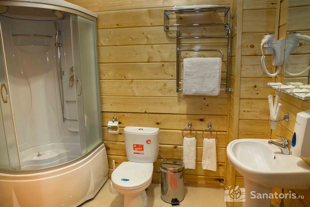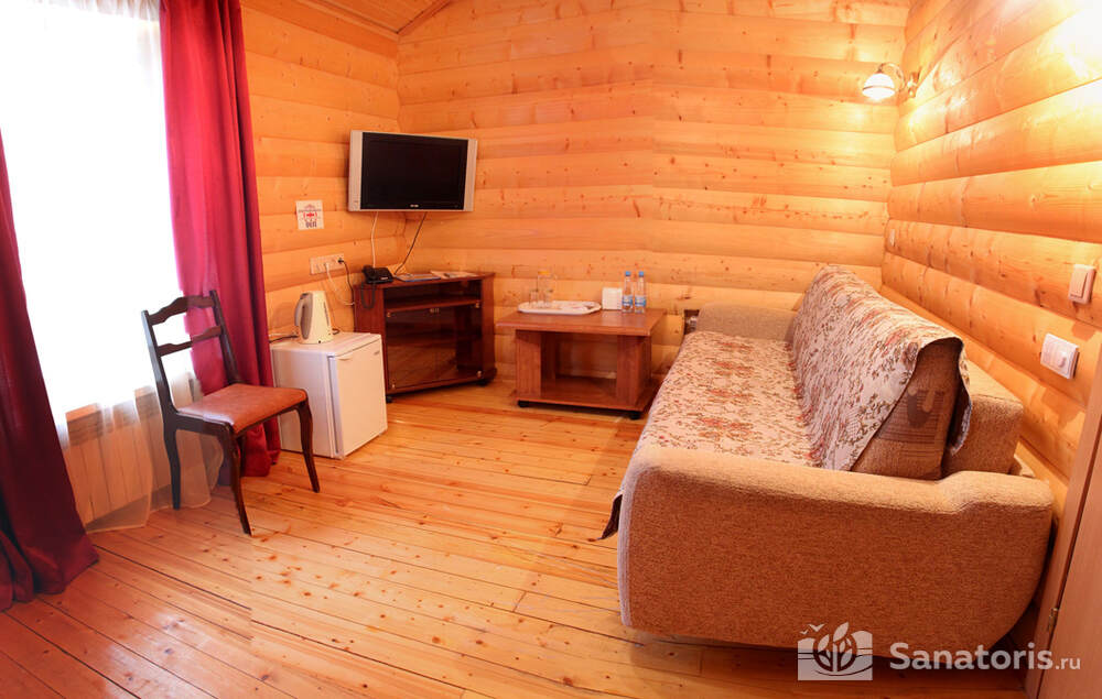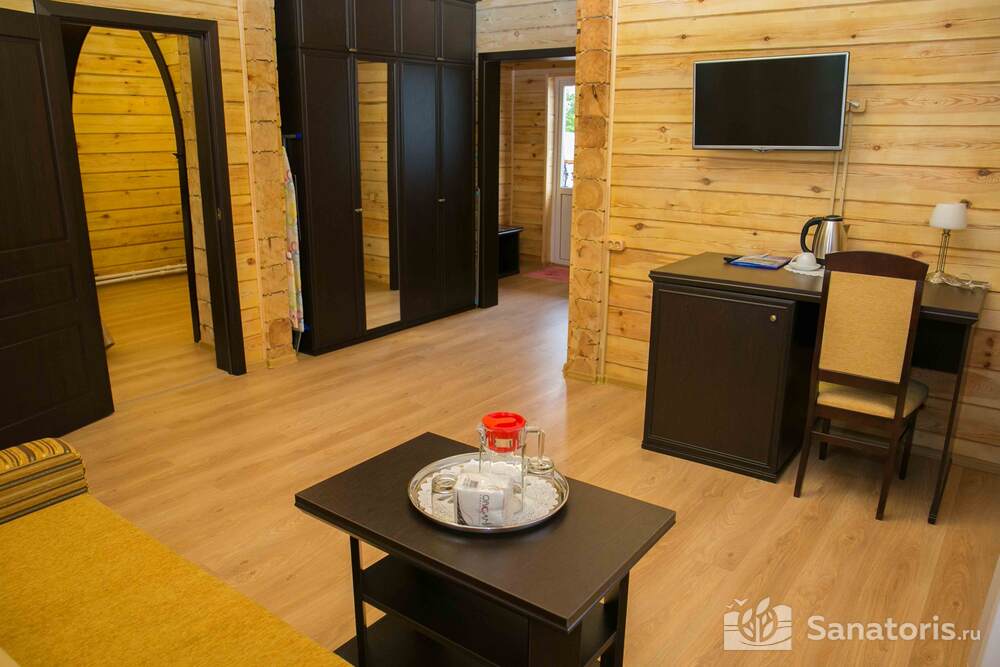 В каждом номере предусмотрен плазменный телевизор, небольшой холодильник и сейф. В корпусе №14 санузел и душ находятся на этаже. Остальные корпуса и отдельно стоящие коттеджи предполагают наличие удобств в номере. Хорошо продуманный дизайн апартаментов отличается функциональностью. Все детали максимально продуманы и лаконичны.