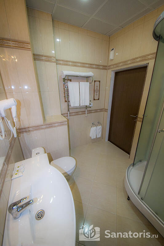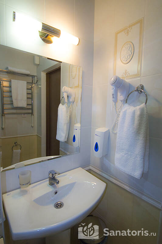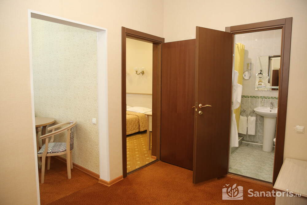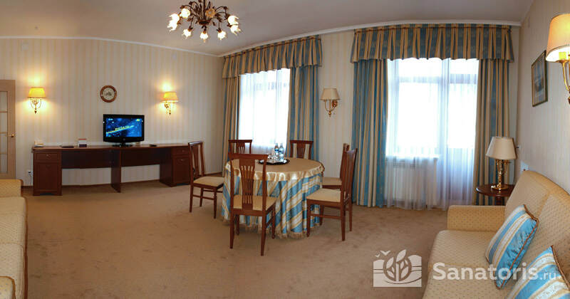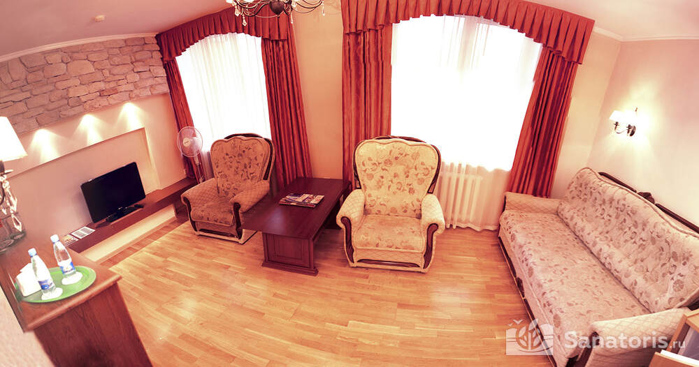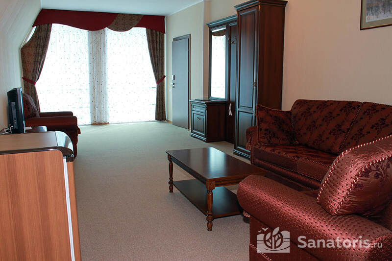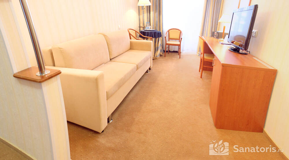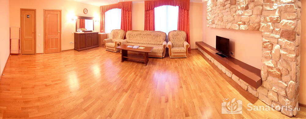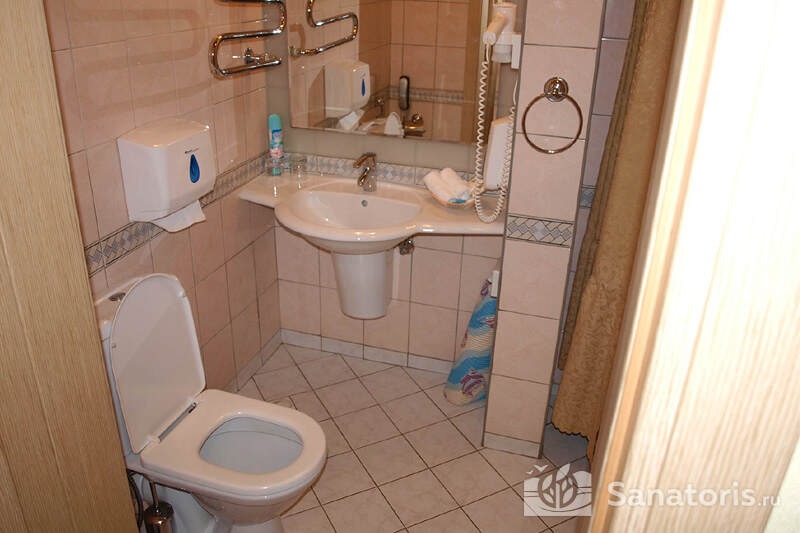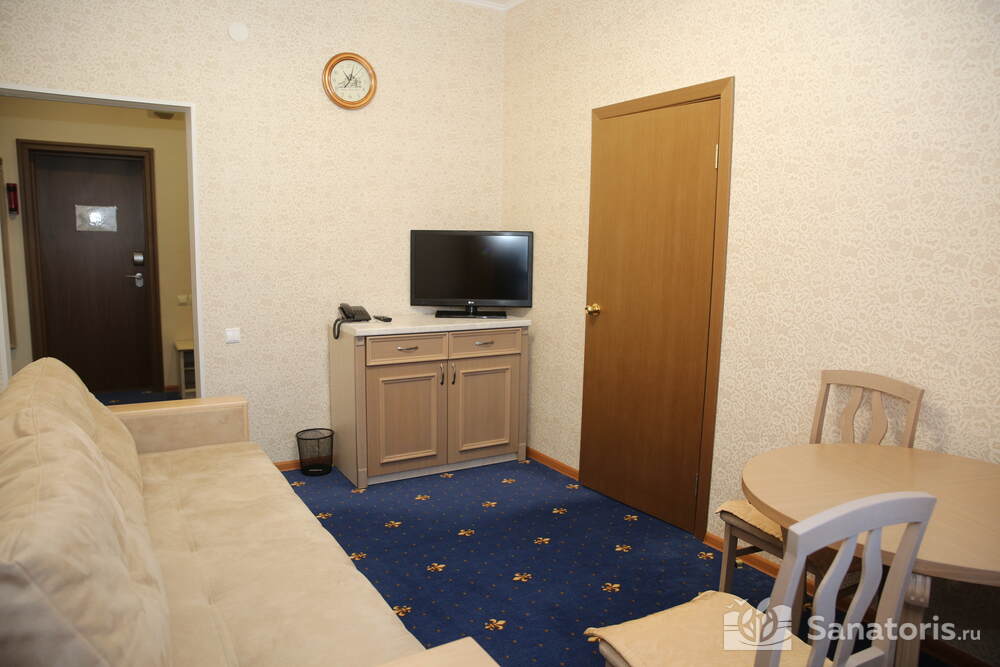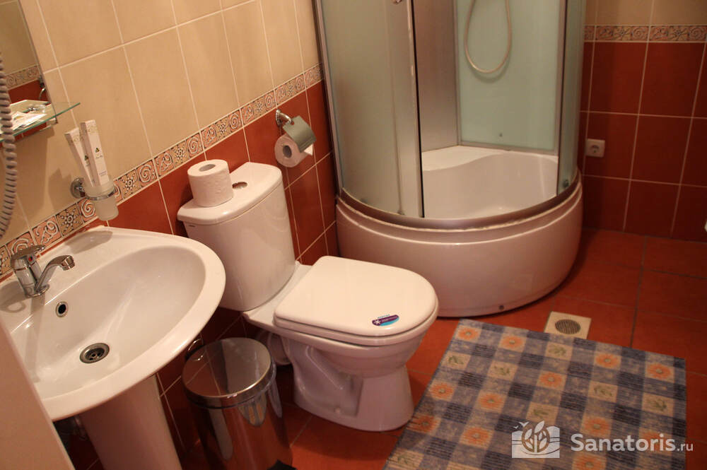 В каждом номере предусмотрен плазменный телевизор, небольшой холодильник и сейф. В корпусе №14 санузел и душ находятся на этаже. Остальные корпуса и отдельно стоящие коттеджи предполагают наличие удобств в номере. Хорошо продуманный дизайн апартаментов отличается функциональностью. Все детали максимально продуманы и лаконичны.