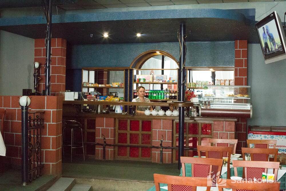 Для питания постояльцев предусмотрено две столовые. Первый зал находится между третьим и четвертым корпусом. Второй обеденный зал расположен в первом корпусе. Представлено три вида питания (комплексные обеды, заказное меню, шведский стол). Кроме этого в первом корпусе работает уютное кафе, а на территории санатория есть еще один кафетерий.
