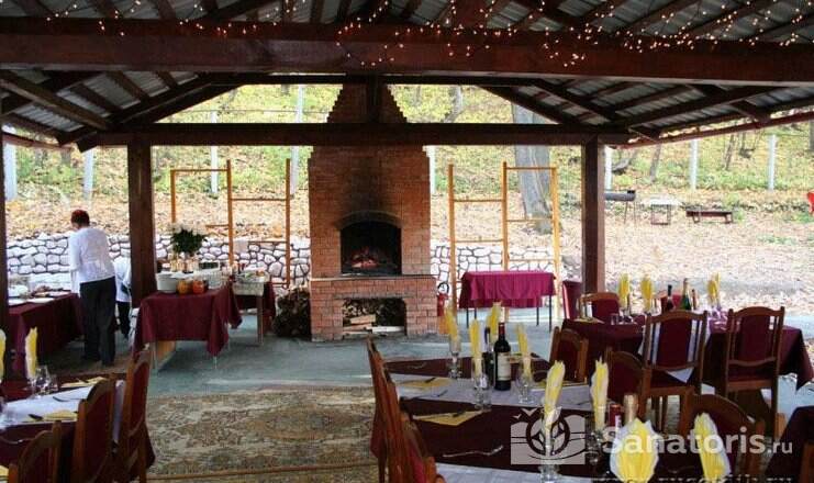 Банкетный зал рассчитан на 30 посадочных мест. Из него есть удобный выход к зоне отдыха, где обустроены мангалы и беседки.