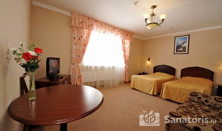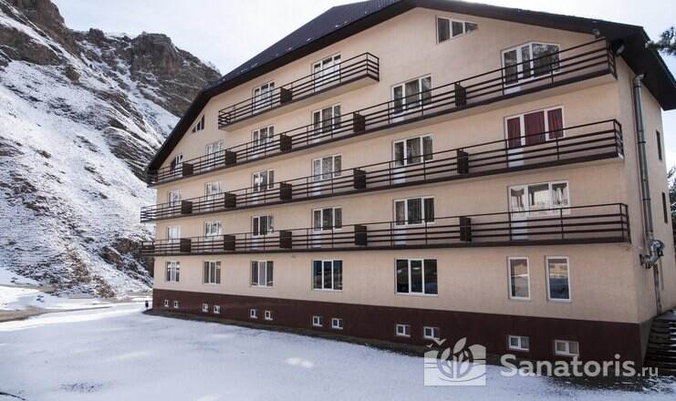Пятиэтажная гостиница по периметру окружена горами. Зимой их вершины покрываются снегом, поэтому они напоминают дворцы царей из снежной страны. На территории комплекса произрастают величественные сосны. Они буквально заглядывают в окна комфортных номеров.