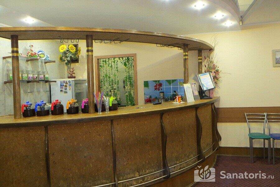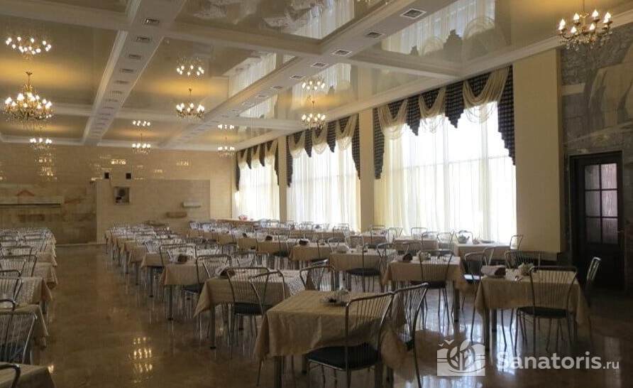 Питание гостей осуществляется в просторном ресторане. Здесь представлено комплексное, детское и диетическое меню. Диету разрабатываются специалисты с учетом индивидуальных особенностей каждого пациента. Для приготовления блюд используются экологически чистые продукты, которые привозят из местных хозяйств.