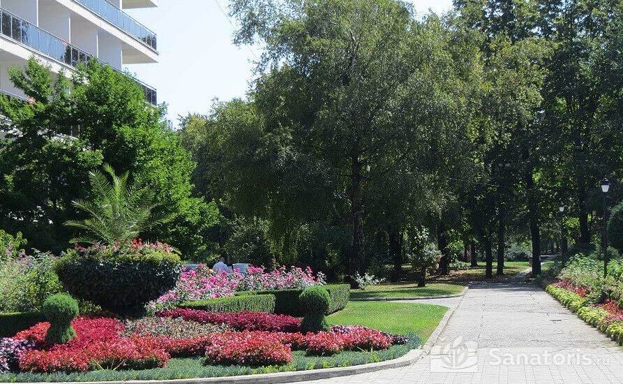 Территория комплекса полностью огорожена и находится под круглосуточной охраной. Площадь здравницы составляет 20 гектаров. Здесь растет много кустарников, цветов и деревьев. В парковой зоне установлены фонтаны, уютные беседки и лавочки.