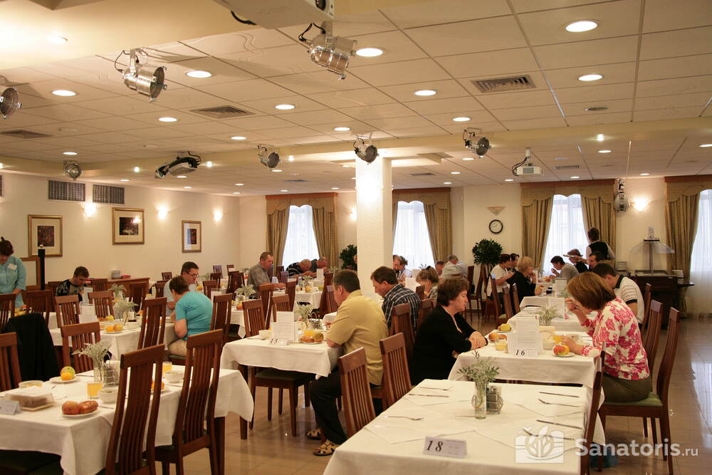 Питание на территории санатория — заказное, трехразовое. Помимо основного рациона предусмотрены диетические, лечебные блюда. Столовая находится на территории ресторана.