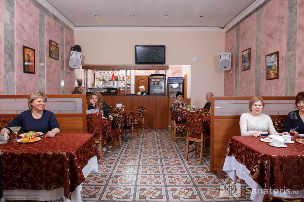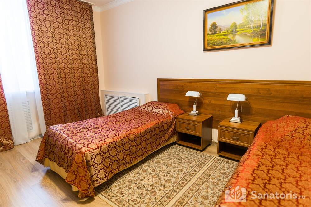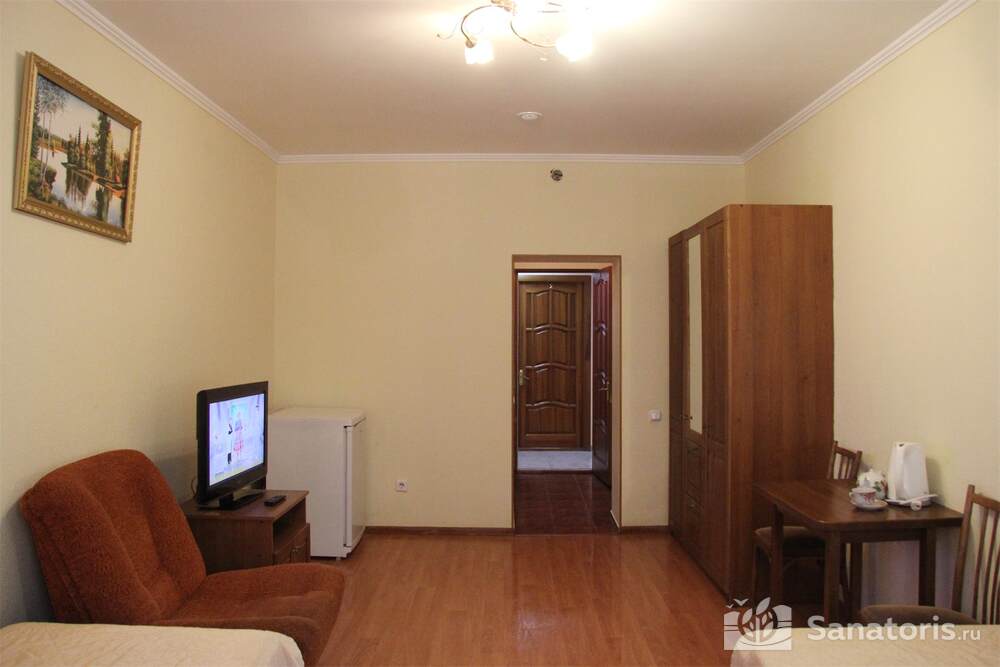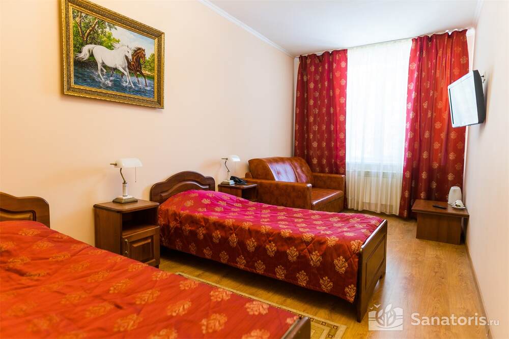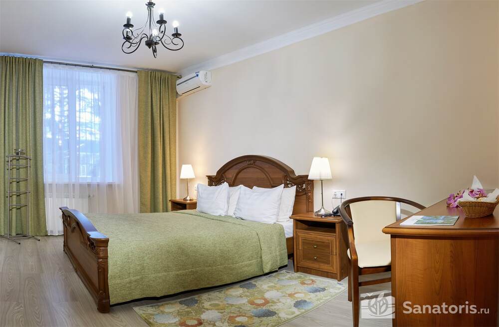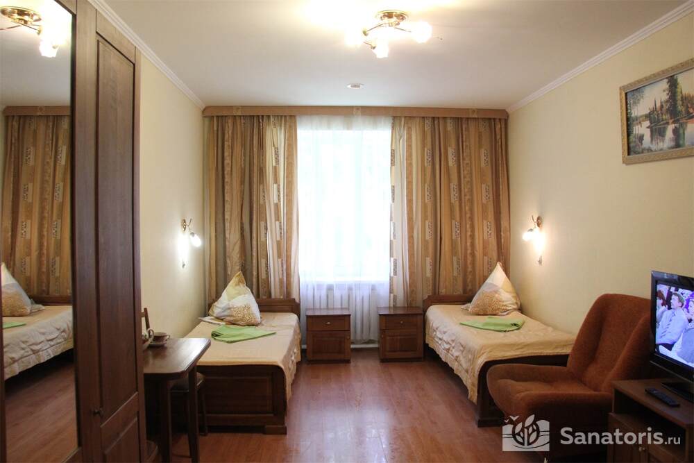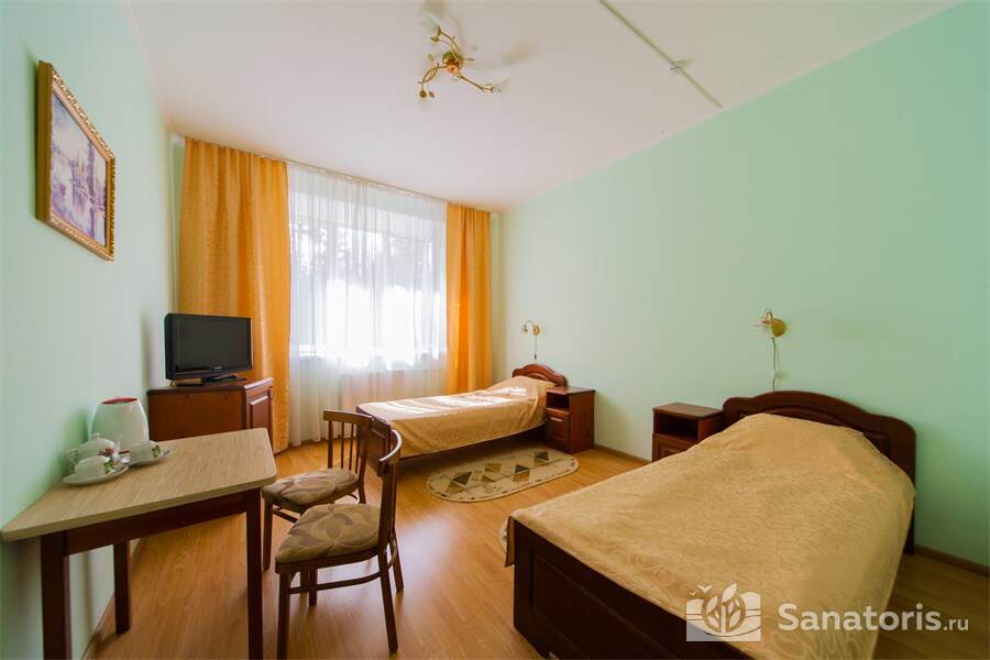 Номера трех категорий. В каждом имеется холодильник, чайник, фен, телевизор. Все что необходимо для комфортного пребывания отдыхающих. Питание организуется три раза в день. Для досуга предлагается зал с тренажерами, вместительный бассейн, баня русского типа.