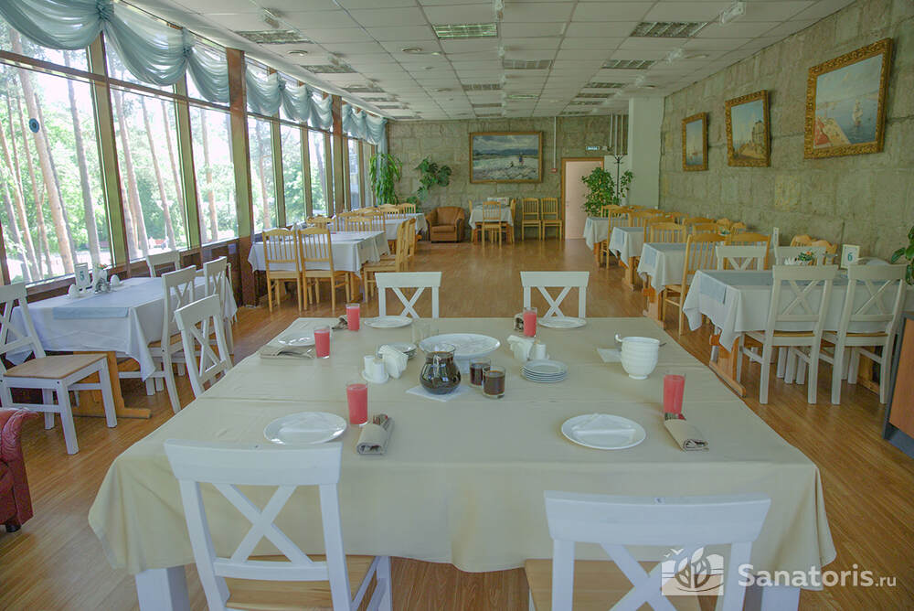 Под помещения столовых отведены залы на 300, 80 и 60 человек. Посетителям три раза в день предоставляется питание по пяти базовым диетам. В ежедневном меню всегда есть широкий выбор вкусных и полезных диетических блюд. Желающие могут перекусить в уютном санаторном кафе с обычным меню.