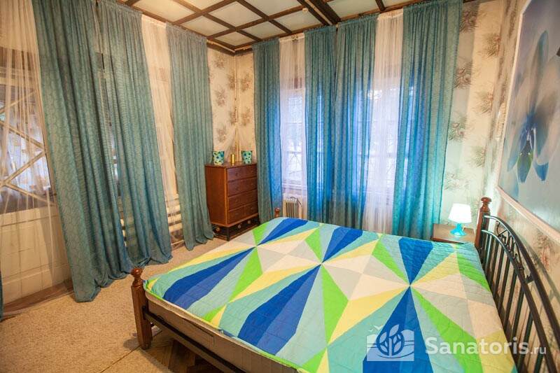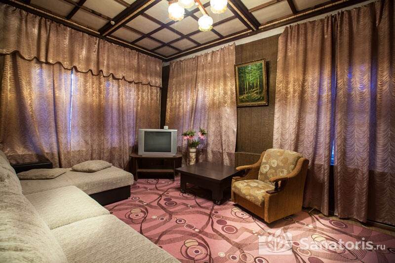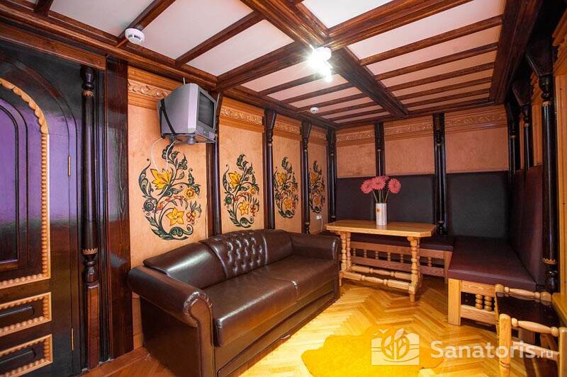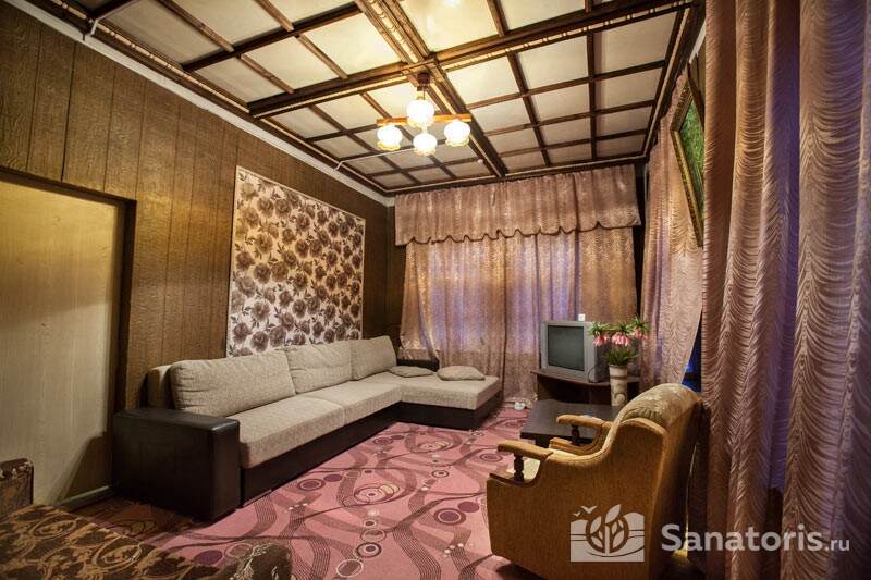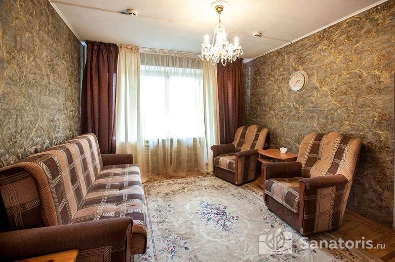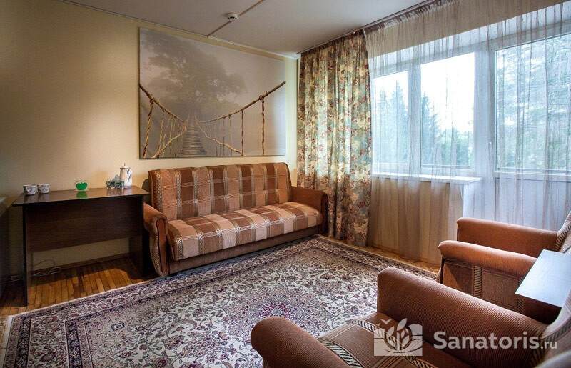 Четыре отдельных здания санатория – два жилых, лечебница и столовая – для удобства сообщаются переходами. В жилых корпусах постояльцы размещаются в уютных одно- и двухместных номерах, оборудованных по классу «стандарт». В номерах имеются: ванная комната с душем, мебель (кровать с прикроватной тумбой, платяной шкаф) и типовой набор электроприборов (телевизор, чайник и холодильник). Трижды в течение недели обслуживающий персонал санатория проводит тщательную уборку жилых комнат.