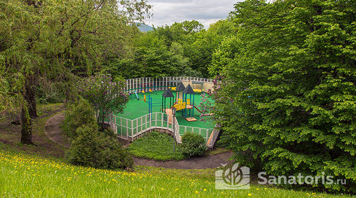 Для маленьких гостей оборудована детская площадка с качелями и песочницей. Оздоровительные процедуры проводят детям от 4 лет под наблюдением терапевта.