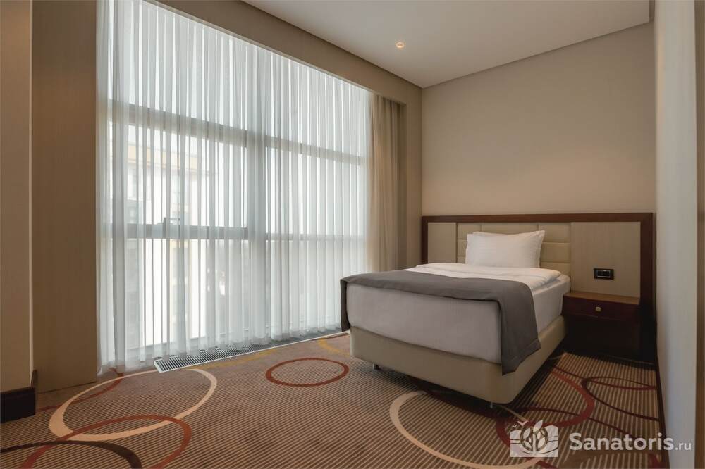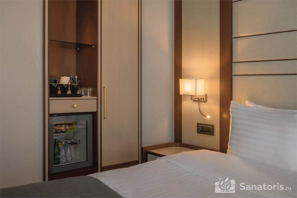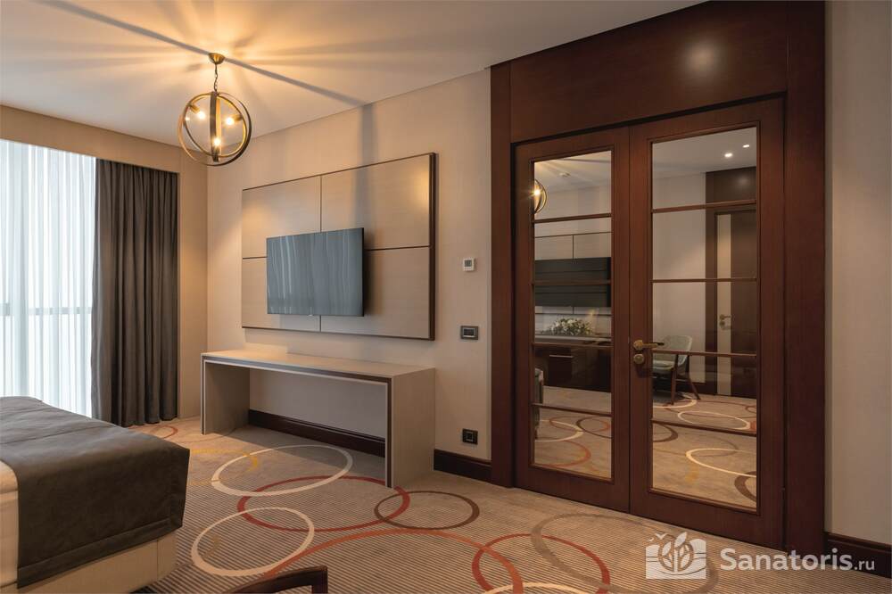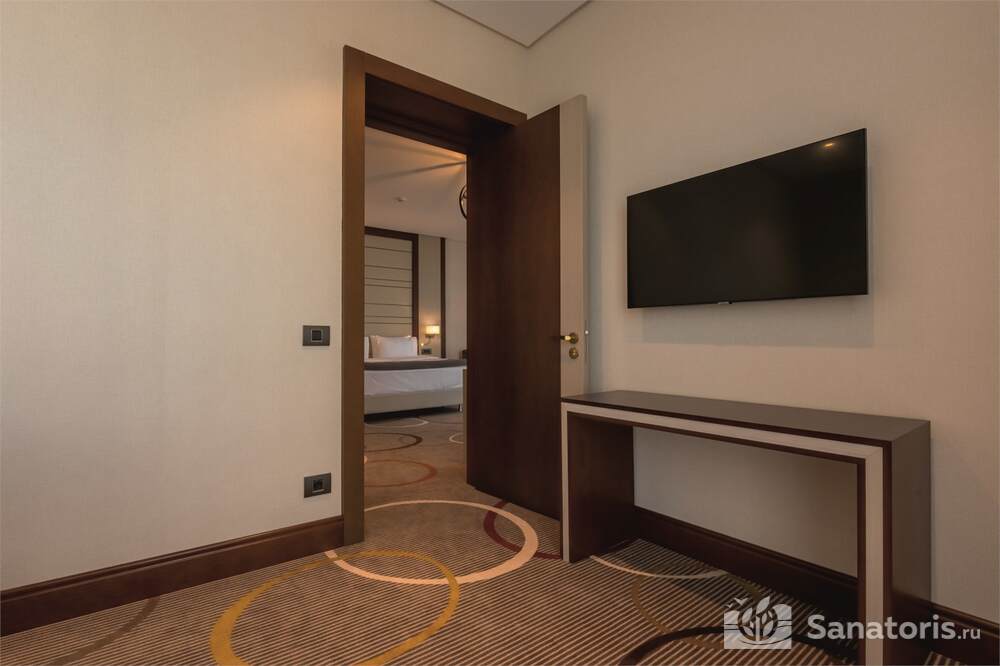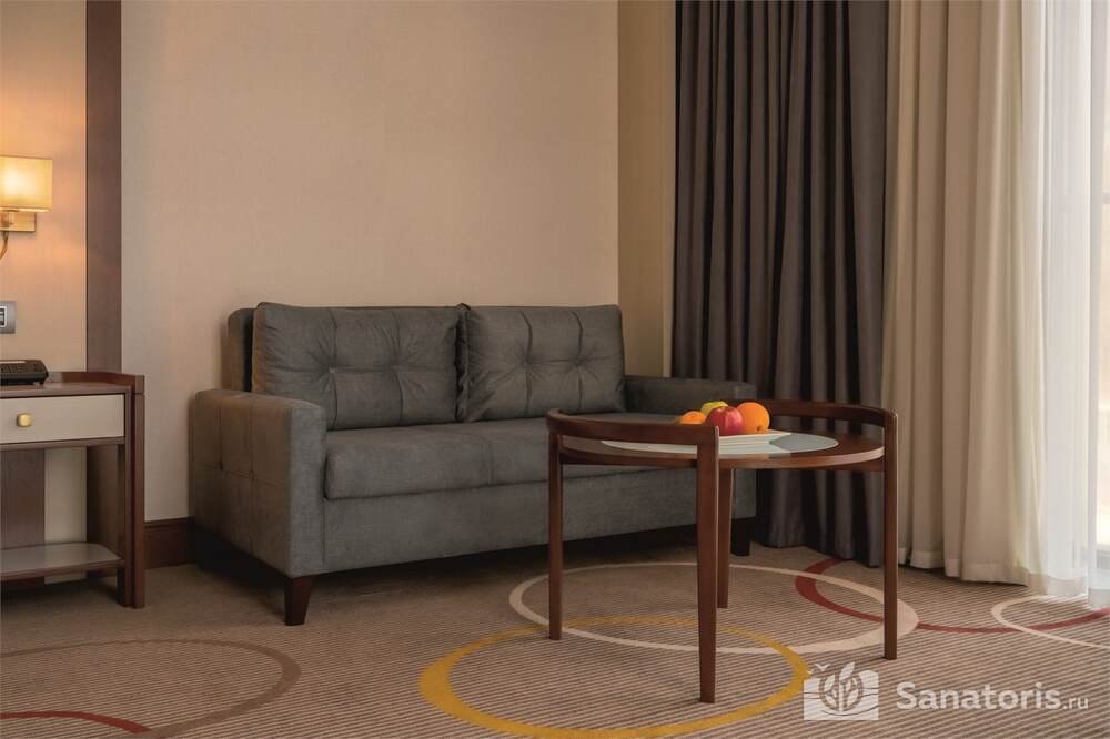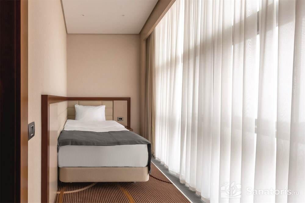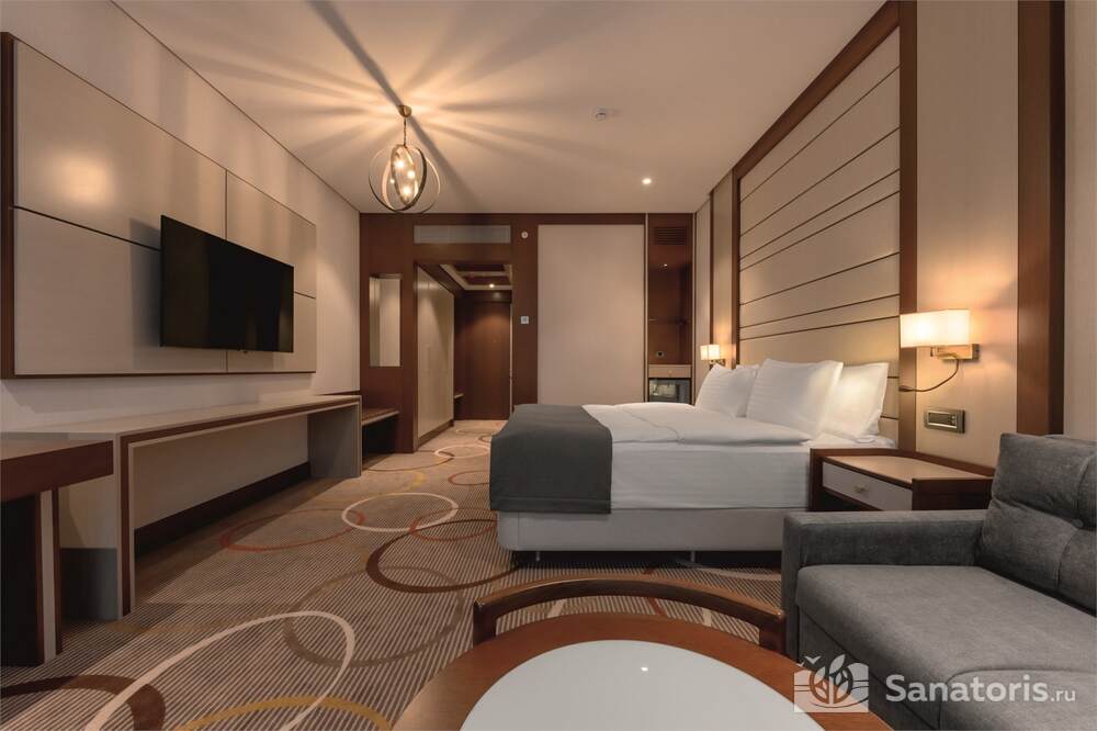 Номера в санатории подразделяются по категориям. Суммарное количество мест для одновременного размещения – 500. Номера есть различной площади. Однокомнатные номера довольно просторные, площадь номера не менее 36 м2. Двухкомнатные по площади есть разные, максимальная площадь такого апартамента составляет 108 м2. В каждом номере созданы максимальные удобства для проживающих (санузел, ванна, фен, электрический чайник, холодильник, телевизор, кондиционер, подключен Wi-Fi).