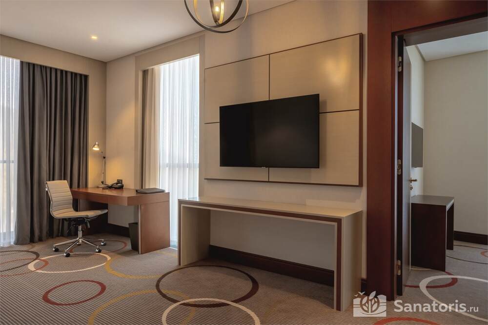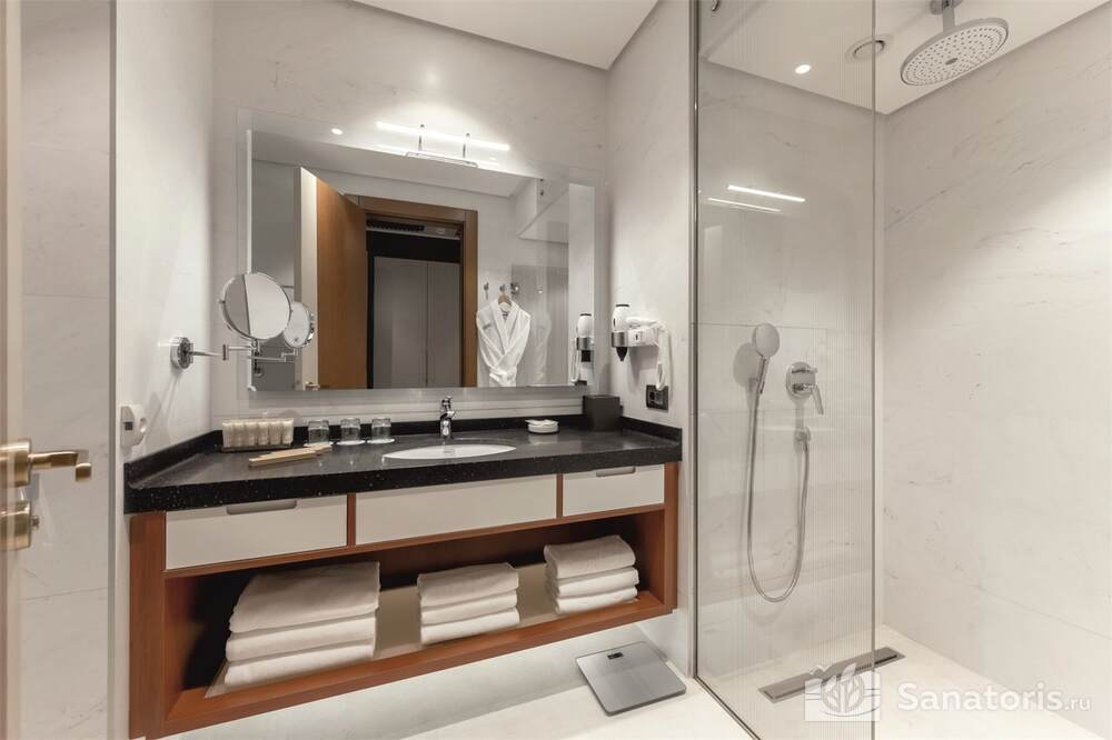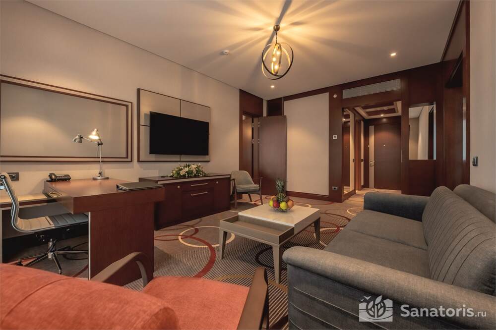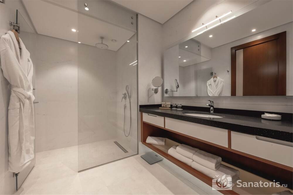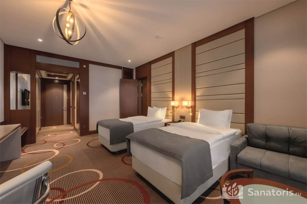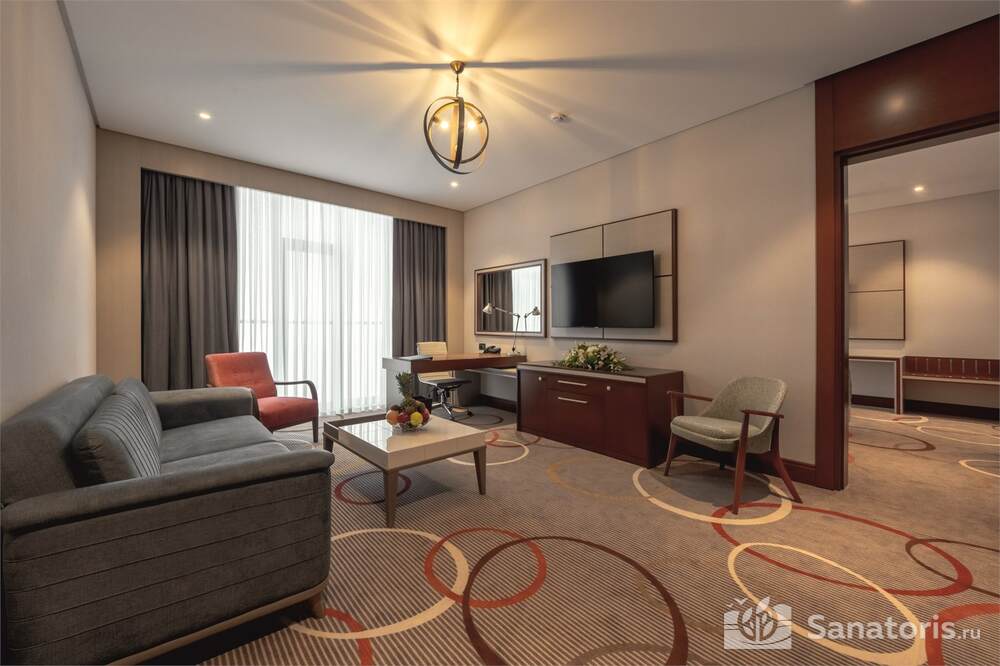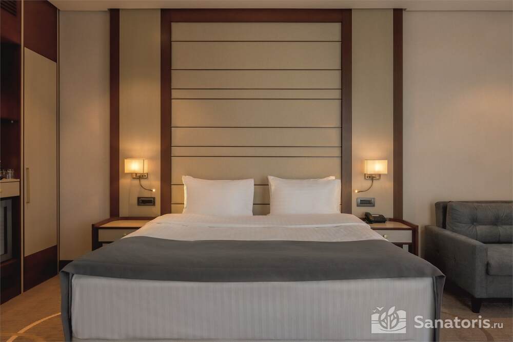 Номера в санатории подразделяются по категориям. Суммарное количество мест для одновременного размещения – 500. Номера есть различной площади. Однокомнатные номера довольно просторные, площадь номера не менее 36 м2. Двухкомнатные по площади есть разные, максимальная площадь такого апартамента составляет 108 м2. В каждом номере созданы максимальные удобства для проживающих (санузел, ванна, фен, электрический чайник, холодильник, телевизор, кондиционер, подключен Wi-Fi).