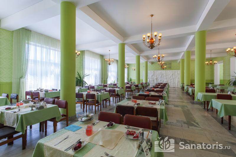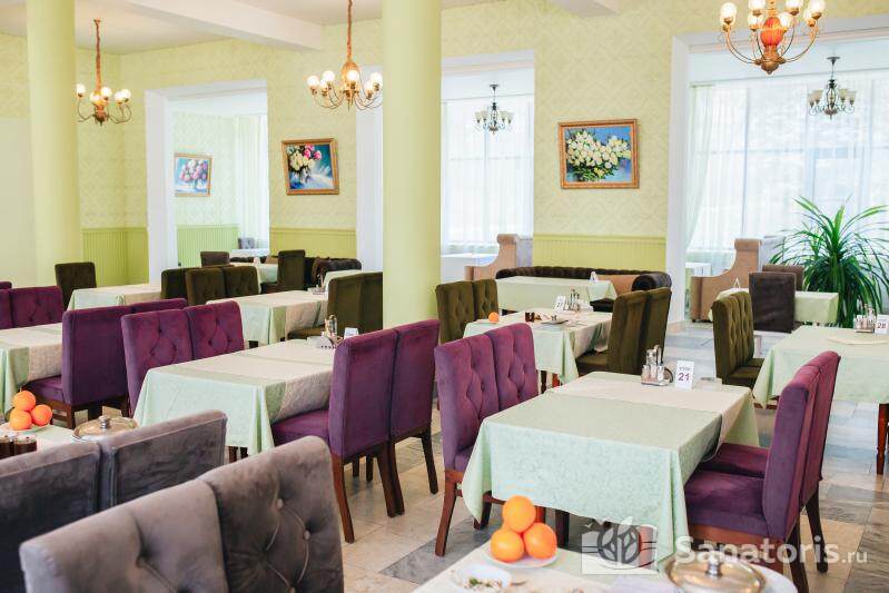 В ресторане организовывается диетическое четырех разовое питание. Обслуживание ведется по заказному меню. Для детей разработано специальное меню. Маленькие гости питаются 5 раз в день сбалансированными блюдами.