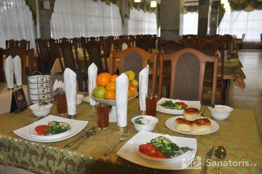 Питание в стенах здравницы осуществляется по предварительному заказу. При этом оно носит диетический характер и всегда учитывает рекомендации, которые да врач после проведения комплексной диагностики. Некоторым отдыхающим назначаются специальные разгрузочные дни. В этом случае предлагаются блюда из творога, кефира, отварного картофеля или яблок. Кому-то рекомендуется магниевая и калиевая диета и тогда меню разрабатывается с учетом таких лечебных назначений.
