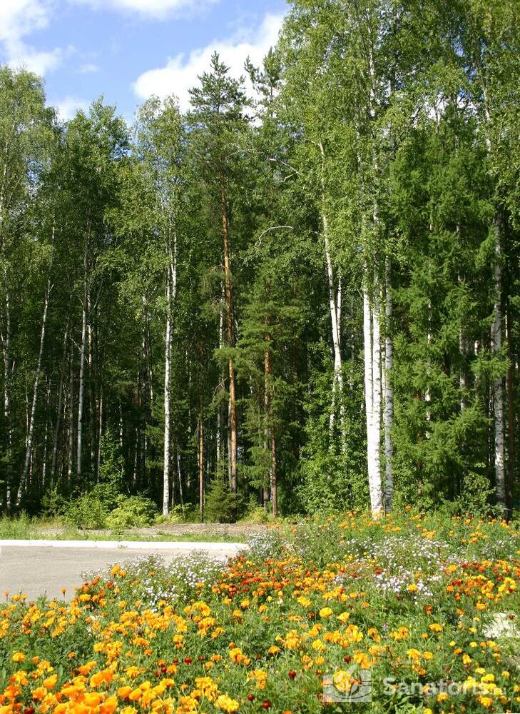 Территория санатория утопает в зелени. Здесь произрастают декоративные кустарники, деревья и цветы. В тени деревьев оборудованы скамейки, где туристы могут отдохнуть и насладиться красотой природы.