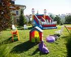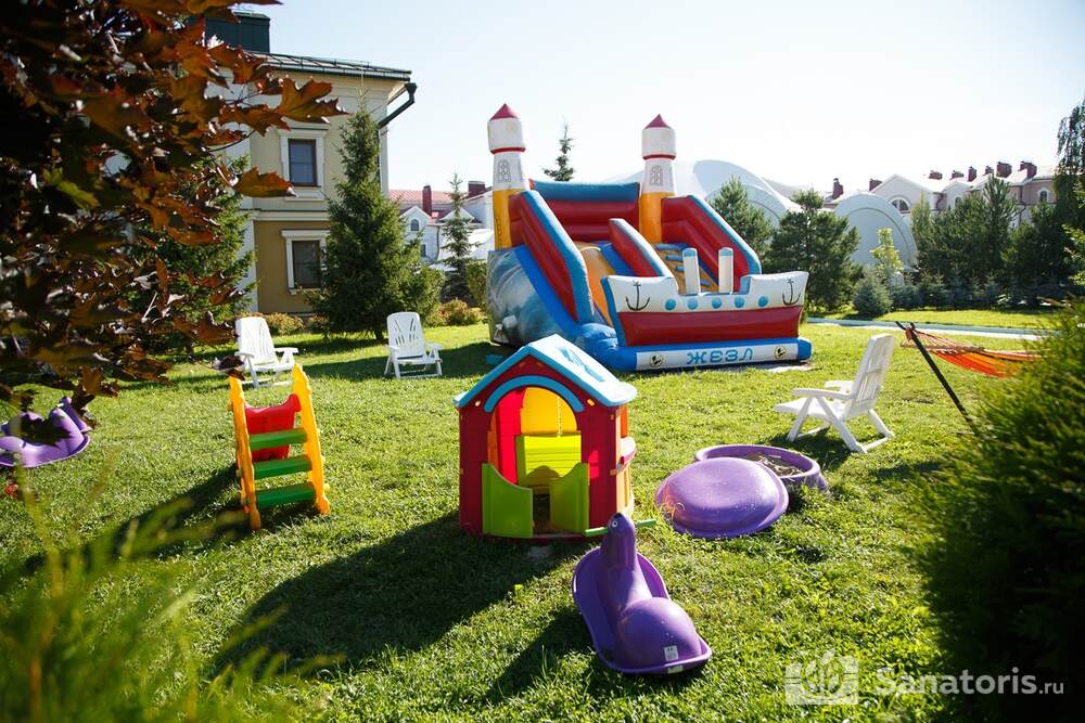 Меленькие гости могут поиграть на свежем воздухе. Для них обустроена специальная площадка с качелями и батутами.