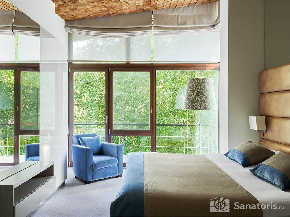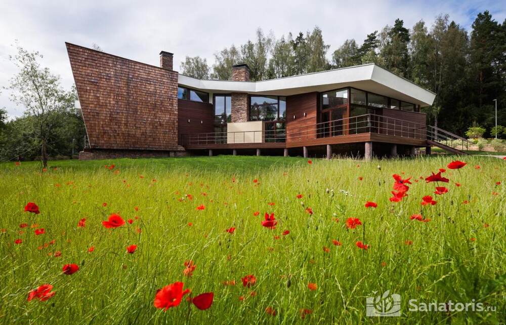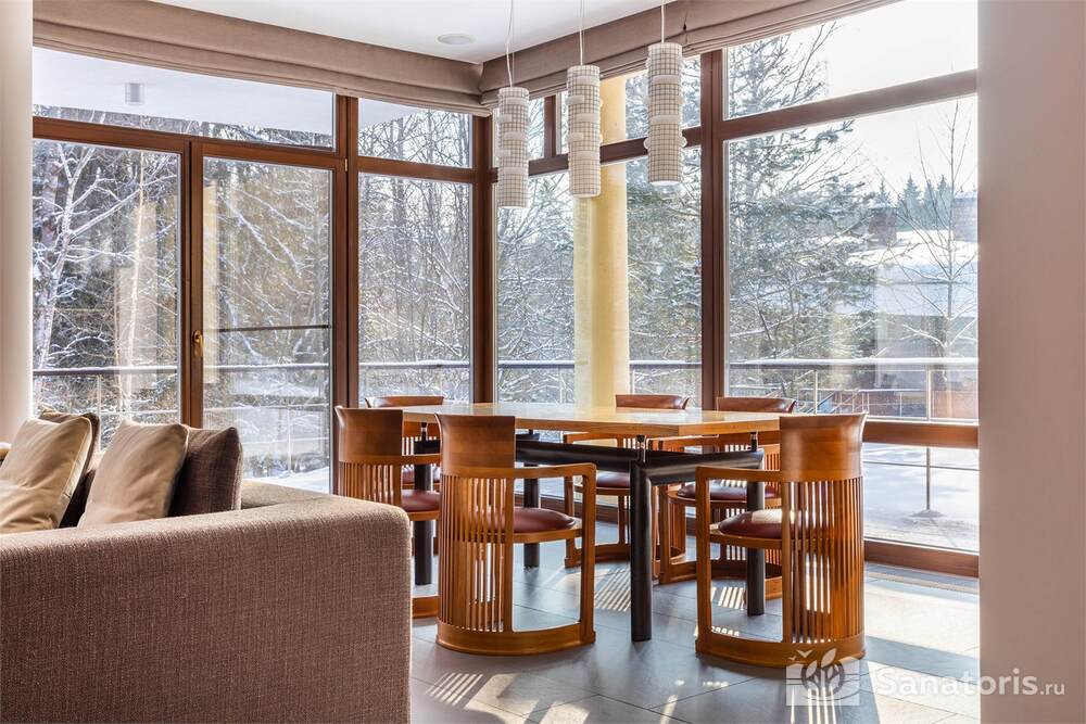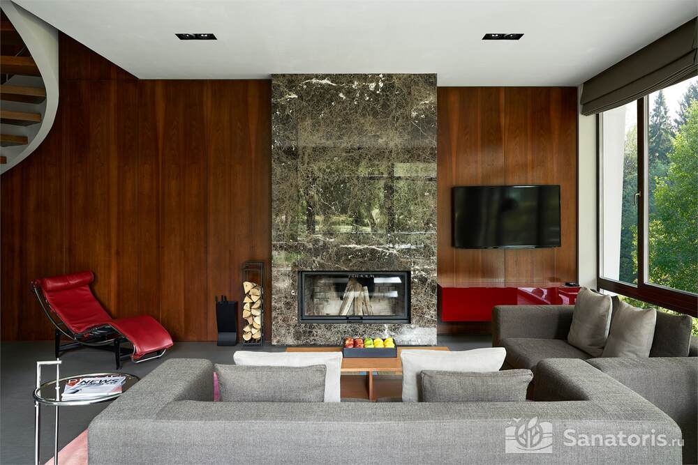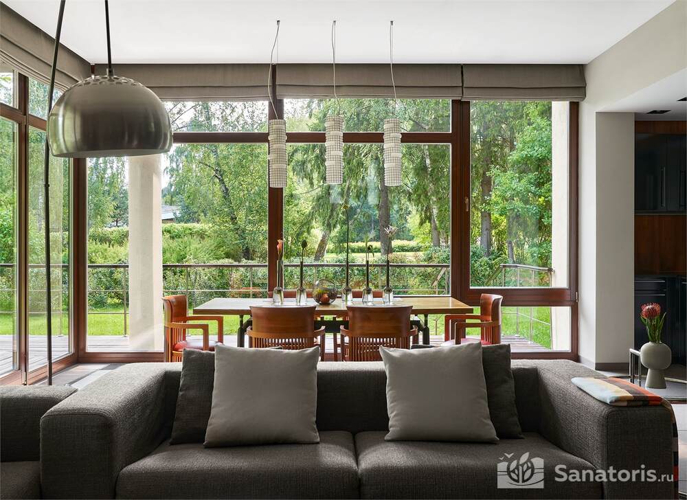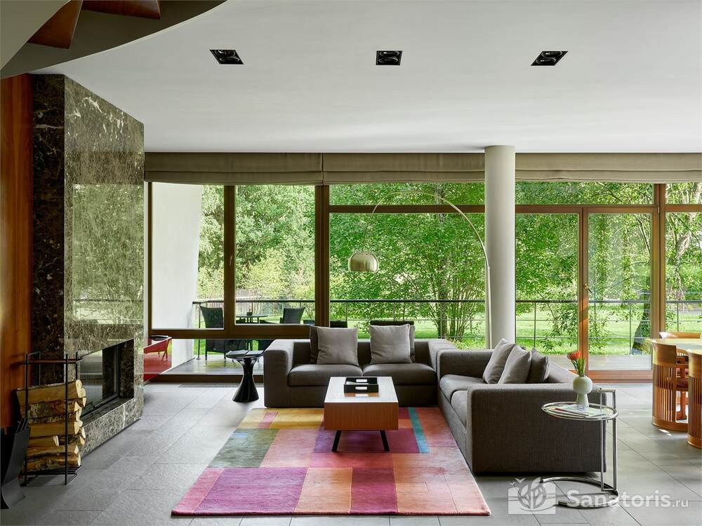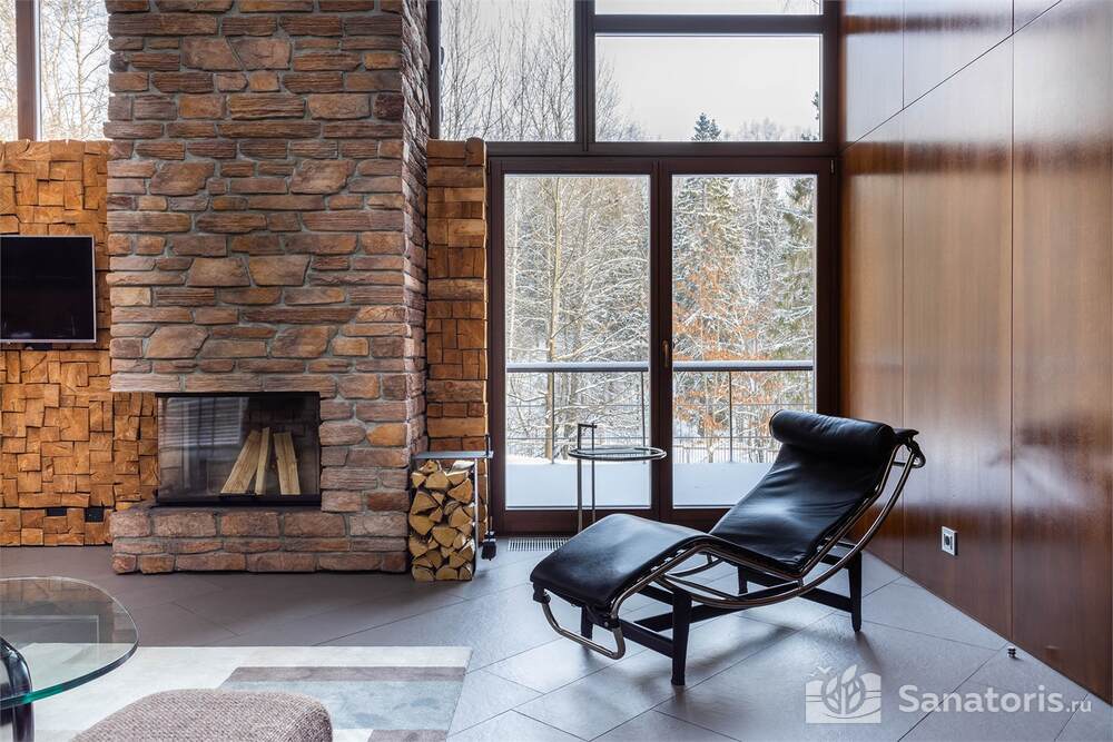 Панорамные окна открывают великолепный вид на лес. Гостей ждут современные спальни, просторная кухня, гостиная комната с камином, гардеробная, большая ванная.