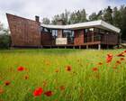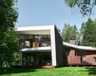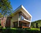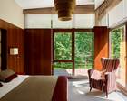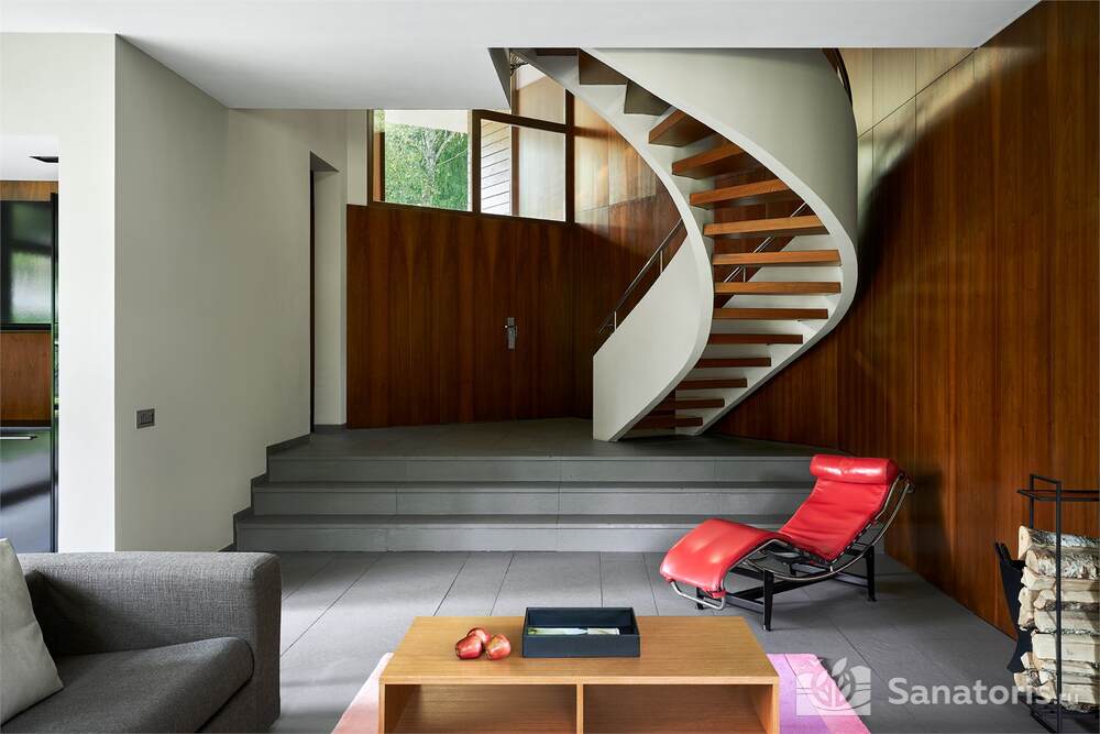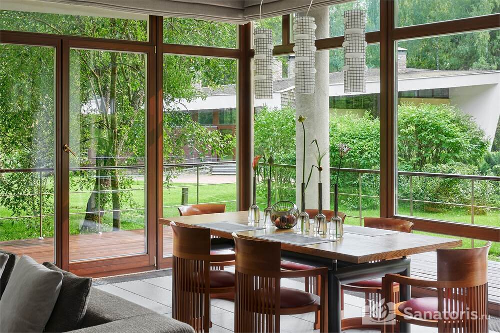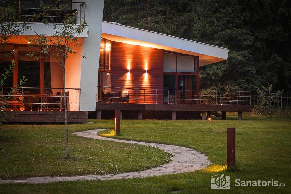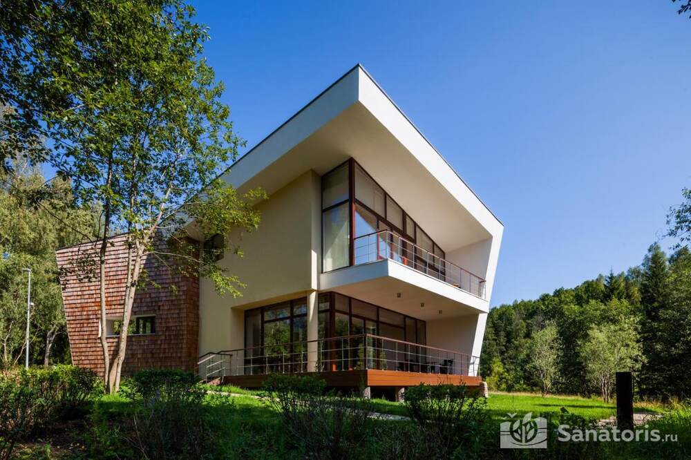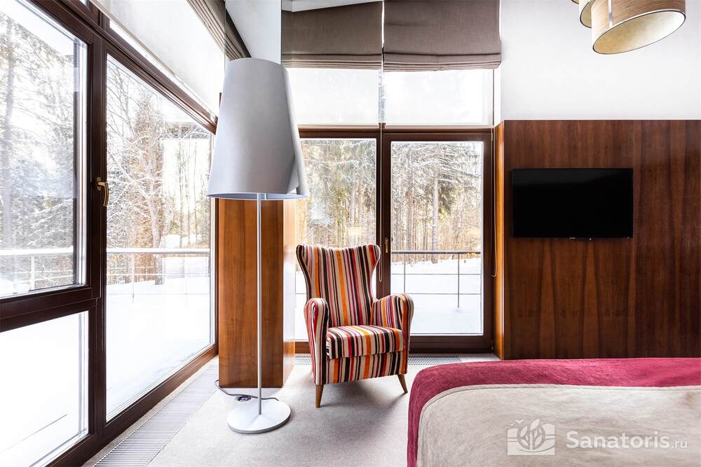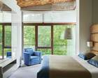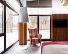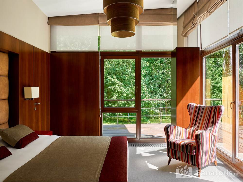 Панорамные окна открывают великолепный вид на лес. Гостей ждут современные спальни, просторная кухня, гостиная комната с камином, гардеробная, большая ванная.