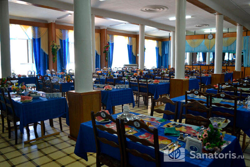 Столовая обеспечивает жильцам правильное питание от 3 до 5 раз в день. Санаторий предоставляет целый комплекс оздоровительных услуг. В водолечебнице пациенты могут принять минеральную ванну с высоким содержанием полезных веществ. Также всем предлагается подводный душ-массаж. Жильцам открыт доступ к источнику полезной воды - питьевому бювету. Врачи регулярно проводят медицинские процедуры: ингаляции, кислородные коктейли. Качественное оборудование позволяет проводить различные виды исследований, в том числе УЗИ, ЭКГ, велоэргометрию . Отдыхающие могут воспользоваться дополнительными услугами, посетить занятие по лечебной физкультуре или отдохнуть на сеансе массажа.